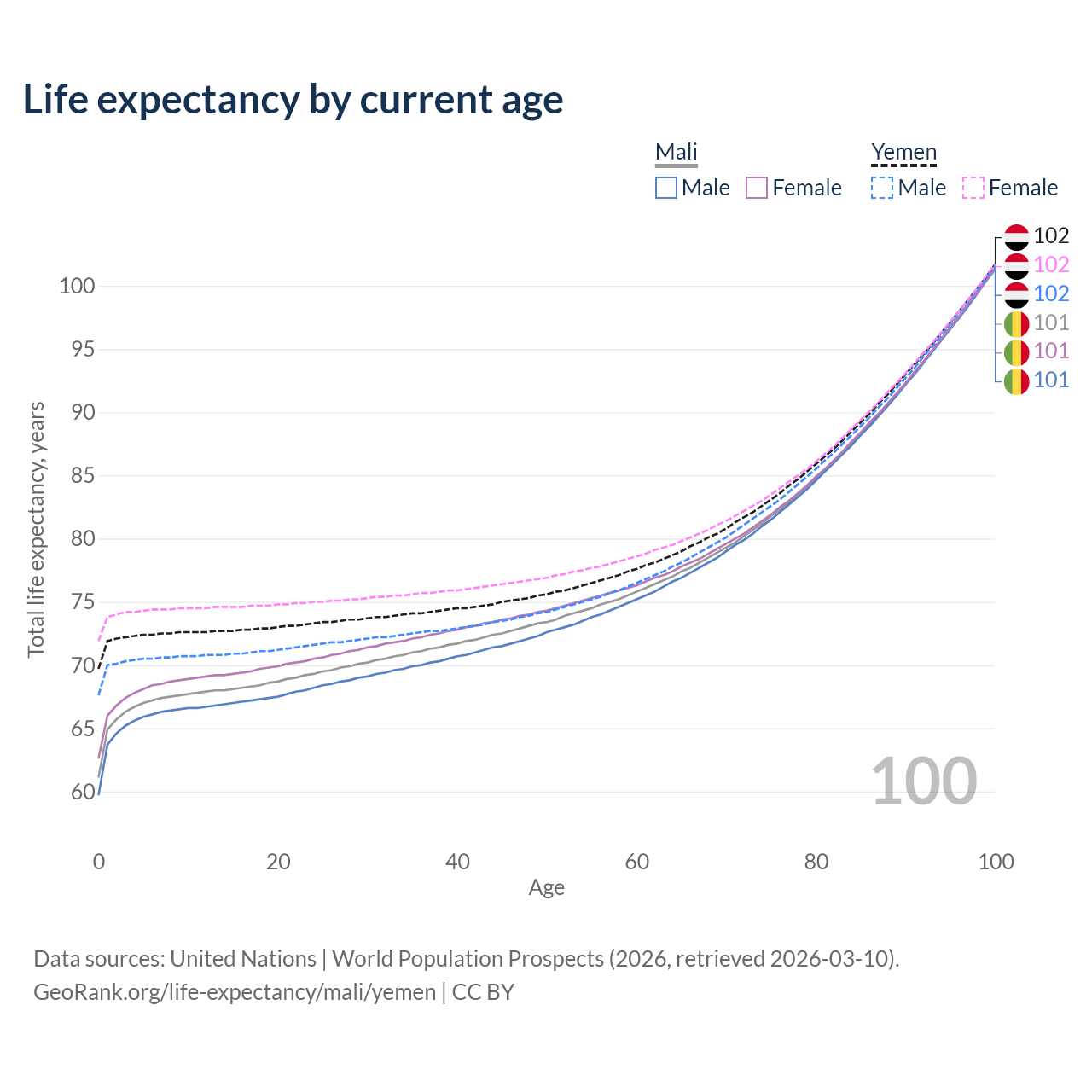 This life expectancy calculator shows the odds of living to 100, 95, 90, and below based on current age for both males and females in Mali and Yemen, along with mean and median age of death. The calculations are based on the 2026 life tables (actuarial tables) from the UN World Population Prospects.