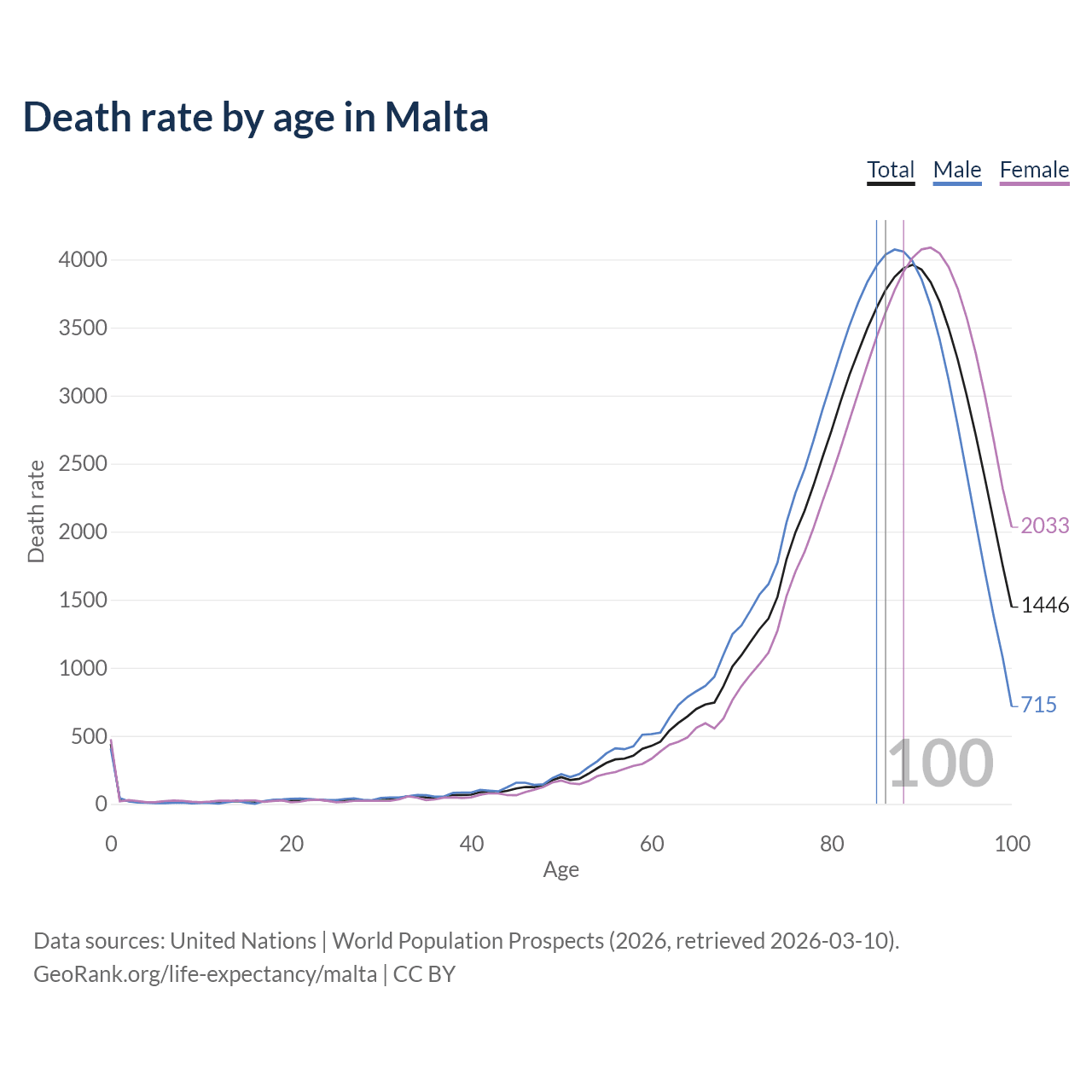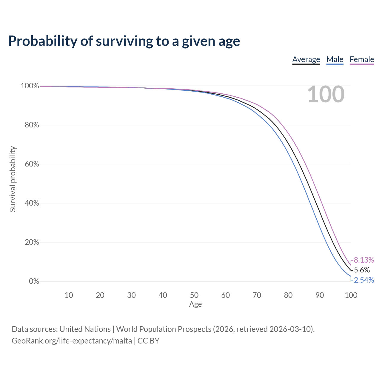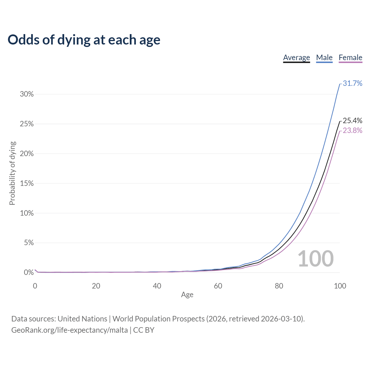 This life expectancy calculator shows the odds of living to 100, 95, 90, and below based on current age for both males and females in Malta, along with mean and median age of death. The calculations are based on the 2026 life tables (actuarial tables) from the UN World Population Prospects.