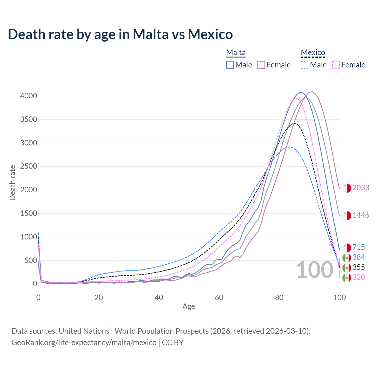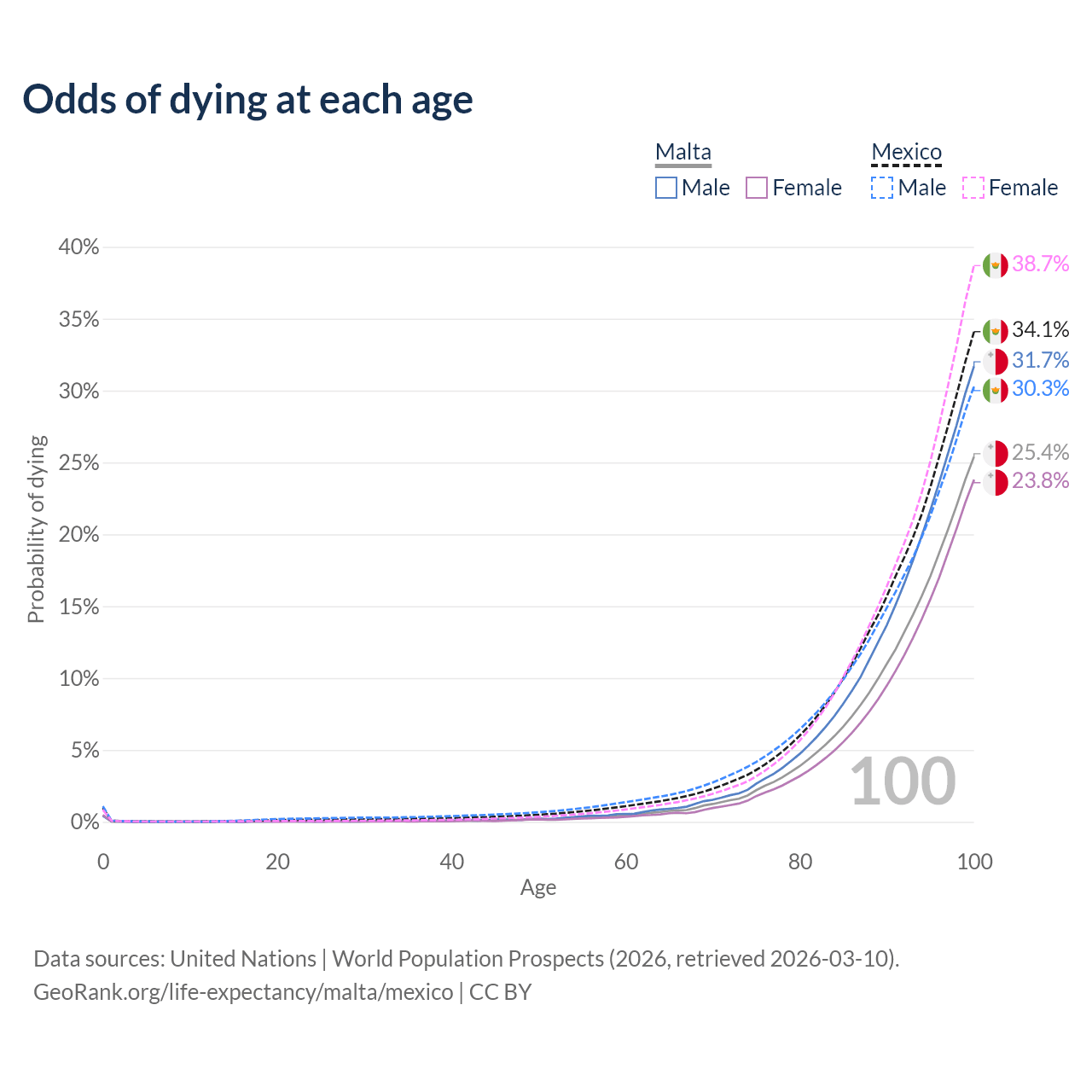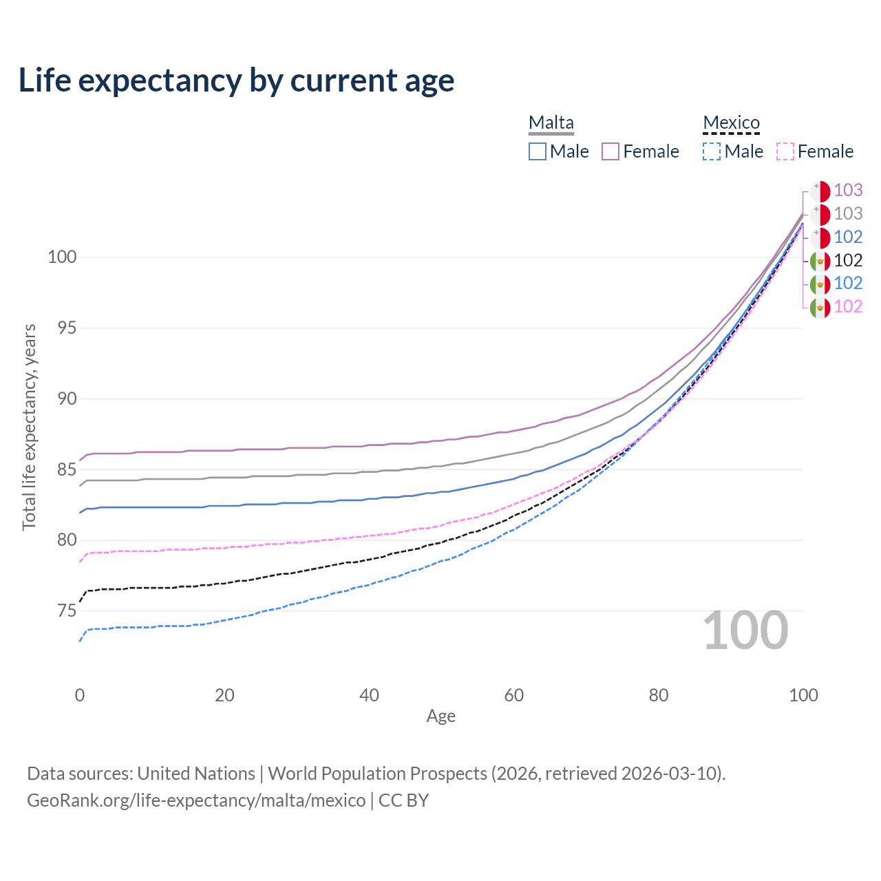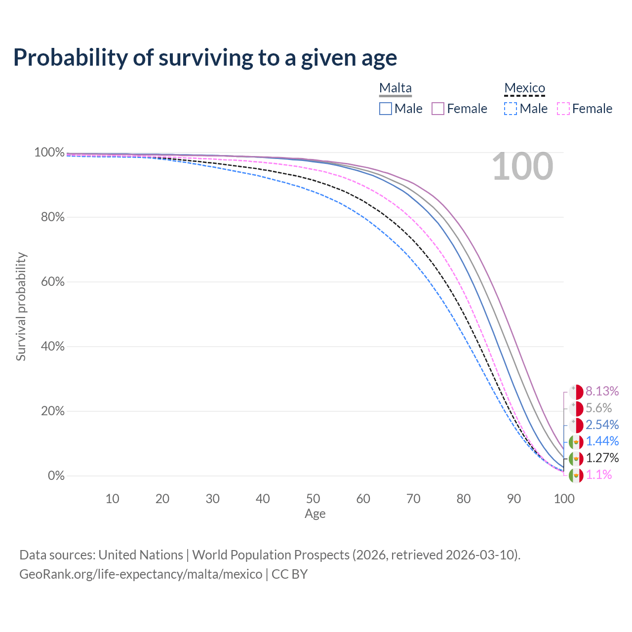 This life expectancy calculator shows the odds of living to 100, 95, 90, and below based on current age for both males and females in Malta and Mexico, along with mean and median age of death. The calculations are based on the 2026 life tables (actuarial tables) from the UN World Population Prospects.