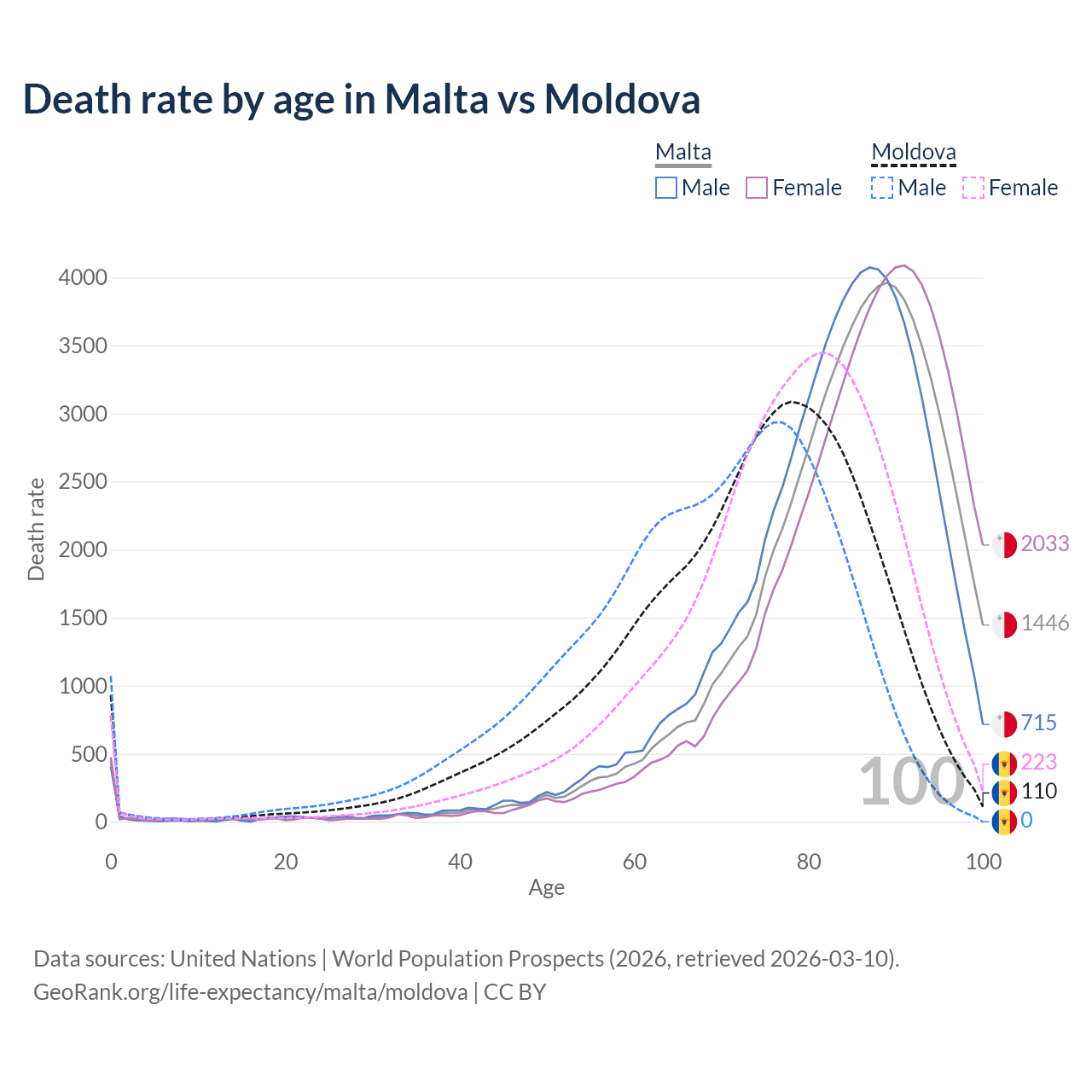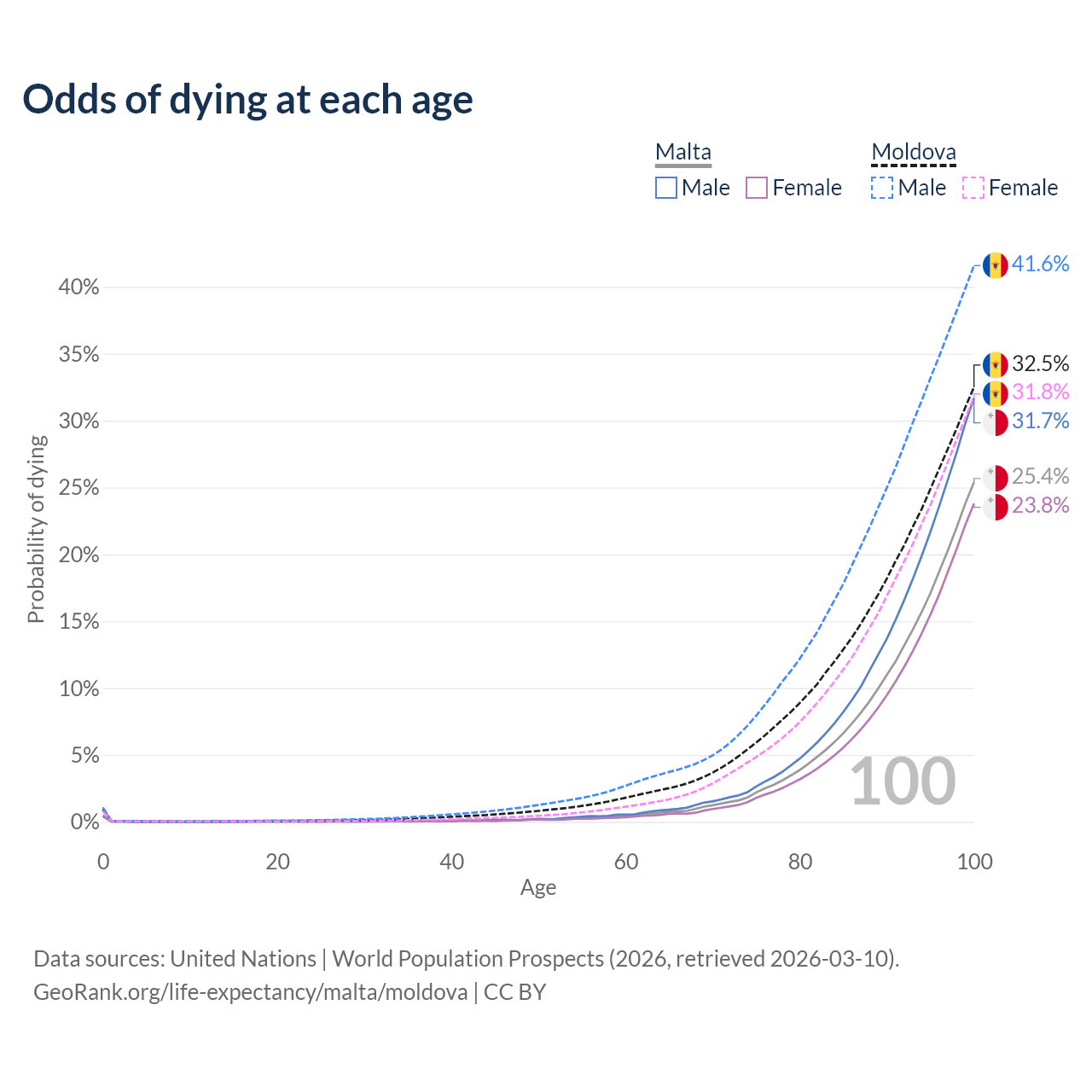 This life expectancy calculator shows the odds of living to 100, 95, 90, and below based on current age for both males and females in Malta and Moldova, along with mean and median age of death. The calculations are based on the 2026 life tables (actuarial tables) from the UN World Population Prospects.