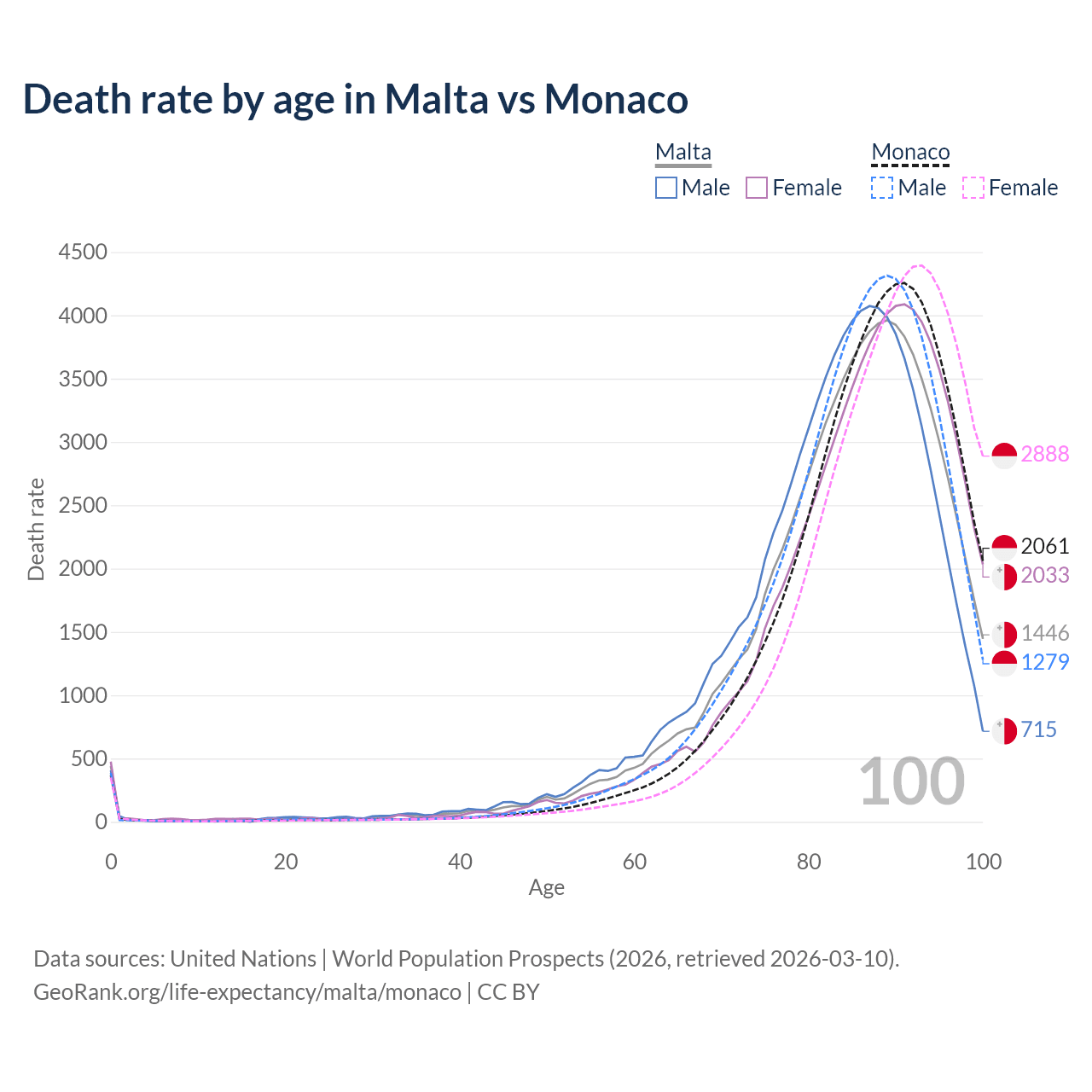 This life expectancy calculator shows the odds of living to 100, 95, 90, and below based on current age for both males and females in Malta and Monaco, along with mean and median age of death. The calculations are based on the 2026 life tables (actuarial tables) from the UN World Population Prospects.
