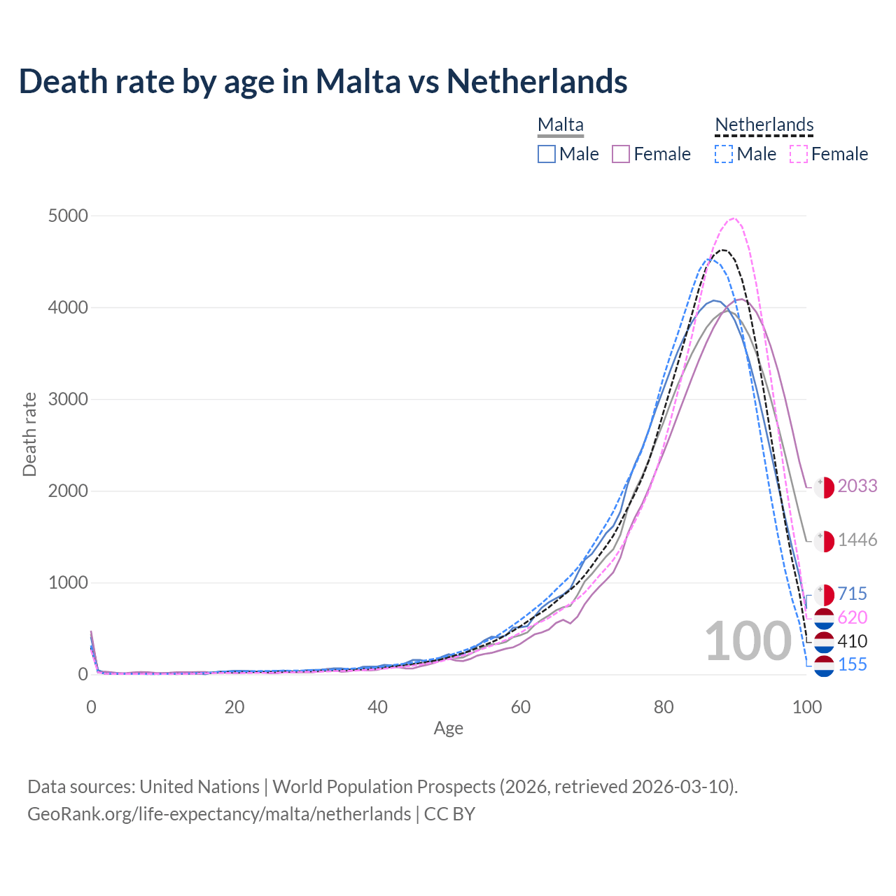This life expectancy calculator shows the odds of living to 100, 95, 90, and below based on current age for both males and females in Malta and the Netherlands, along with mean and median age of death. The calculations are based on the 2026 life tables (actuarial tables) from the UN World Population Prospects.