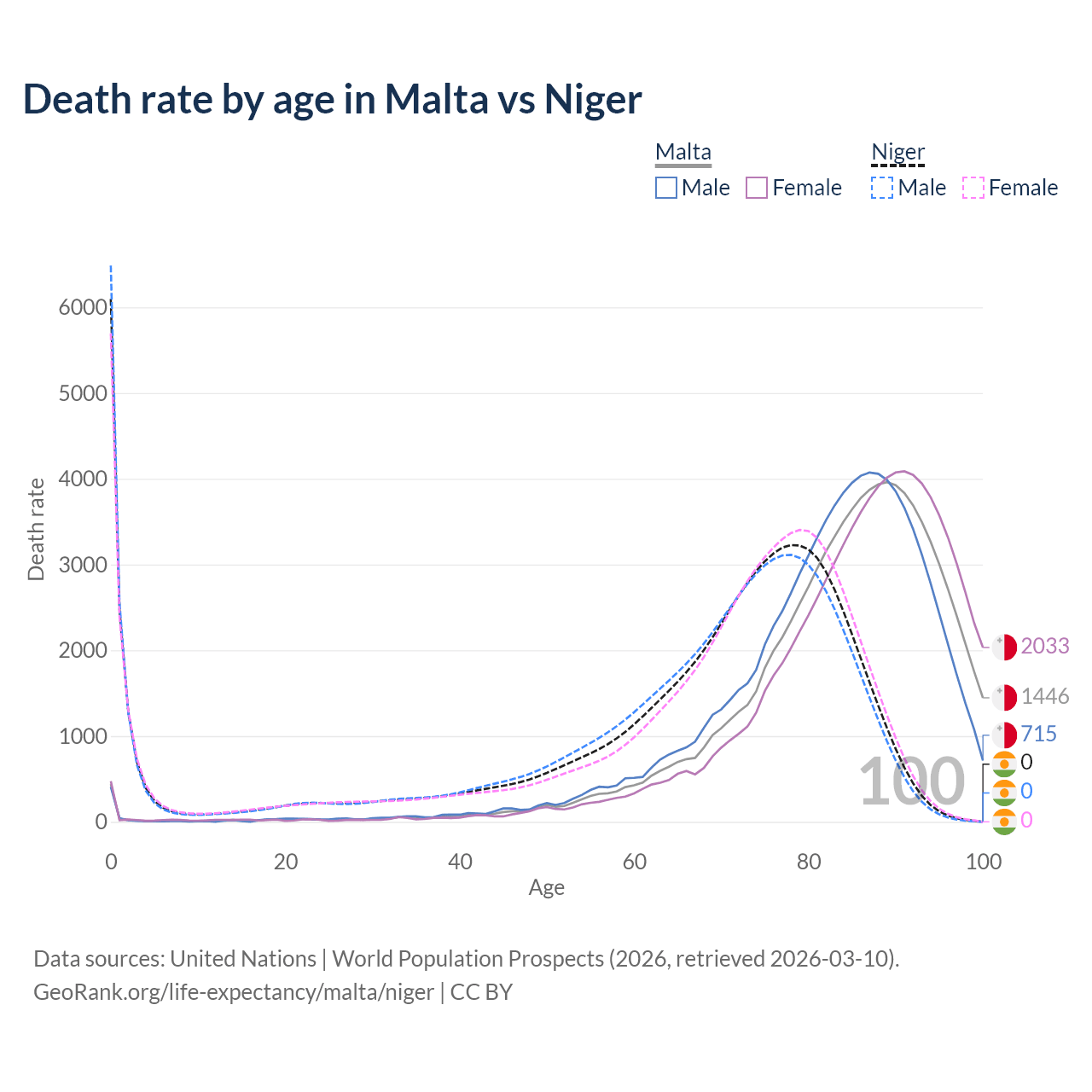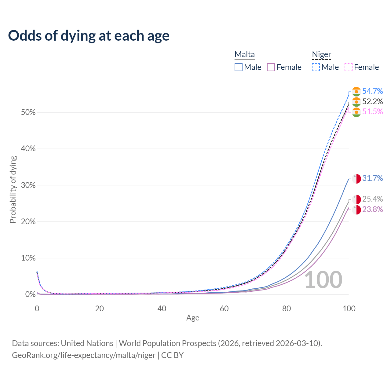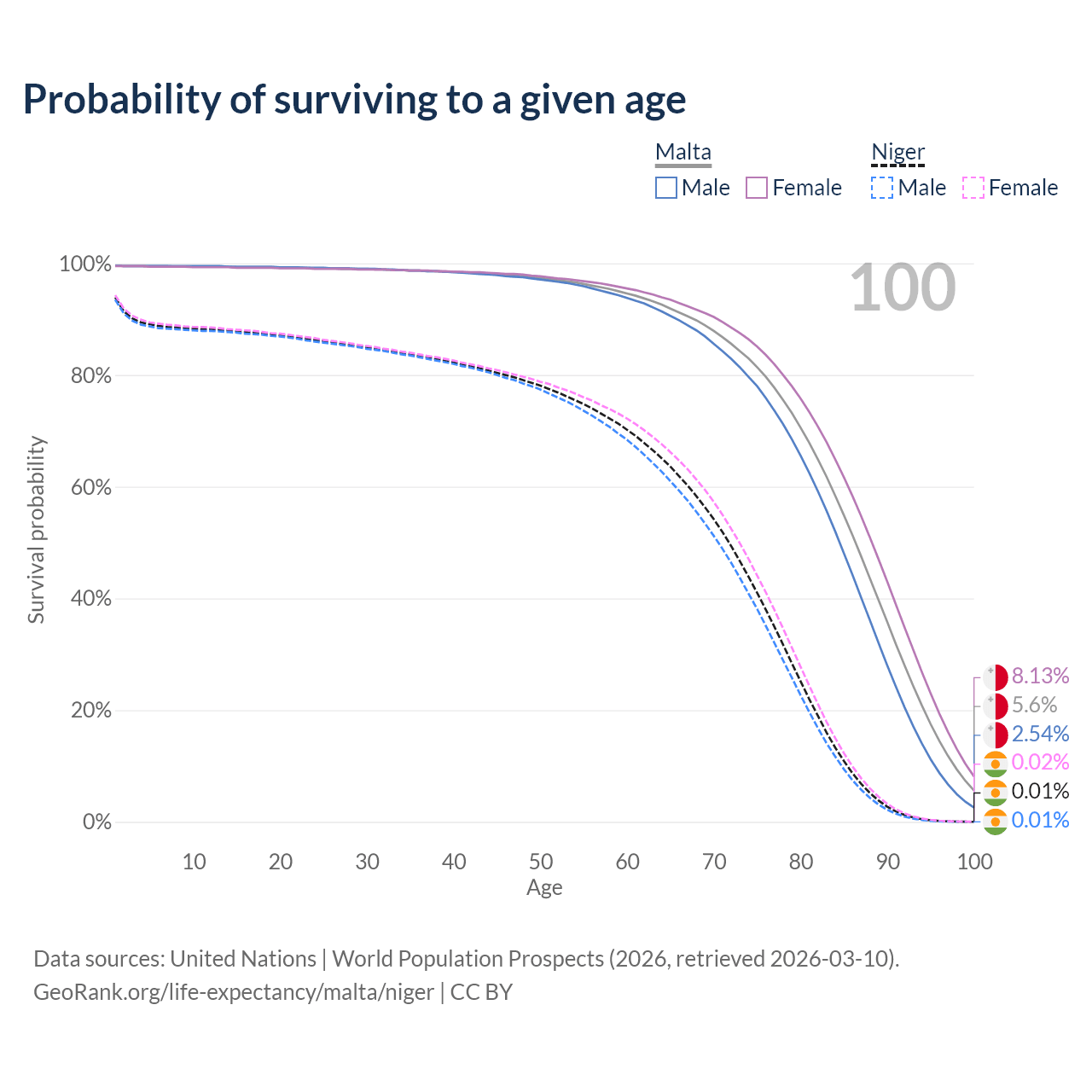 This life expectancy calculator shows the odds of living to 100, 95, 90, and below based on current age for both males and females in Malta and Niger, along with mean and median age of death. The calculations are based on the 2026 life tables (actuarial tables) from the UN World Population Prospects.