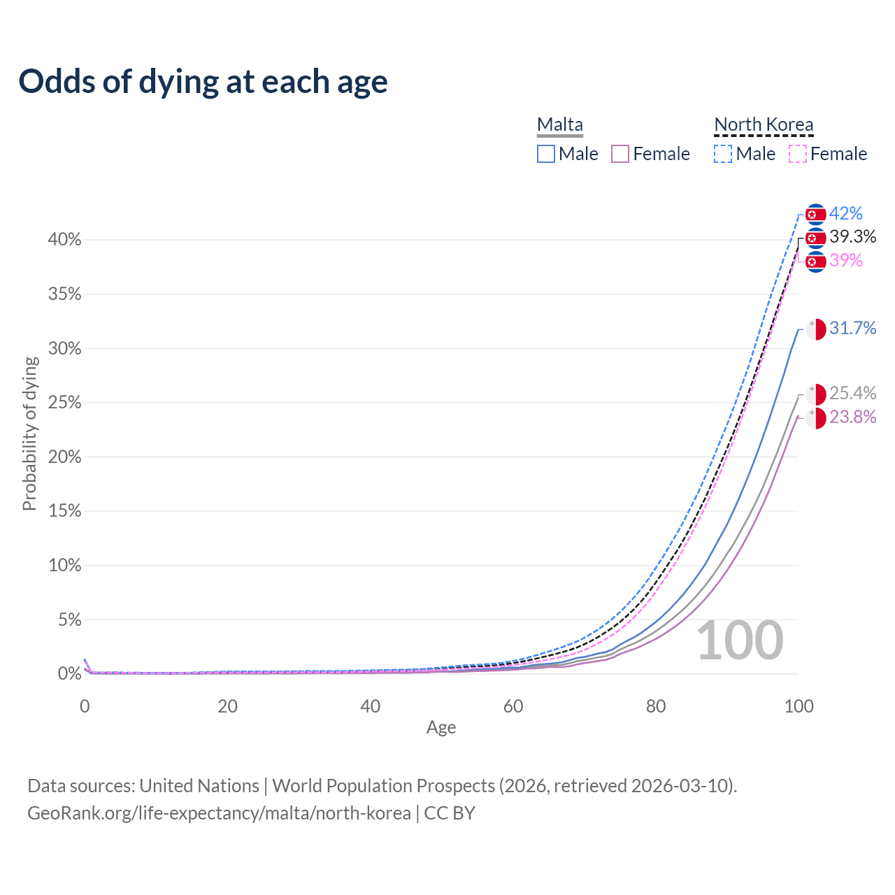 This life expectancy calculator shows the odds of living to 100, 95, 90, and below based on current age for both males and females in Malta and North Korea, along with mean and median age of death. The calculations are based on the 2026 life tables (actuarial tables) from the UN World Population Prospects.