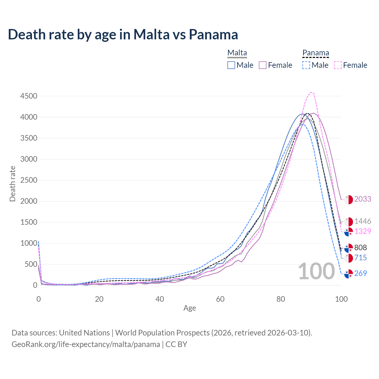 In Malta, the most common age of death is 89, compared to 89 in Panama. The median age of death is 86.3 in Malta and 84.6 in Panama, meaning only half of each cohort is expected to live past that age.