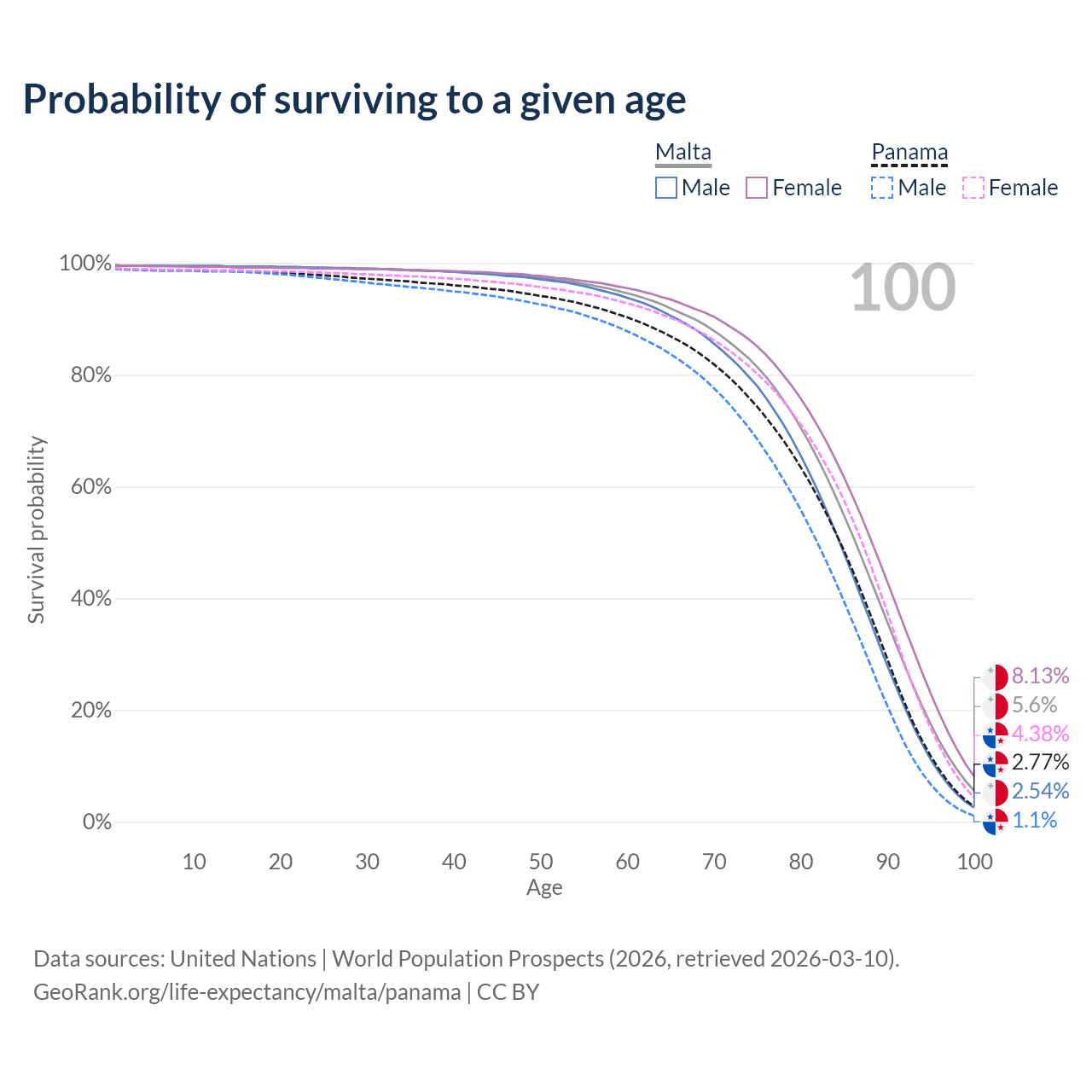 This life expectancy calculator shows the odds of living to 100, 95, 90, and below based on current age for both males and females in Malta and Panama, along with mean and median age of death. The calculations are based on the 2026 life tables (actuarial tables) from the UN World Population Prospects.