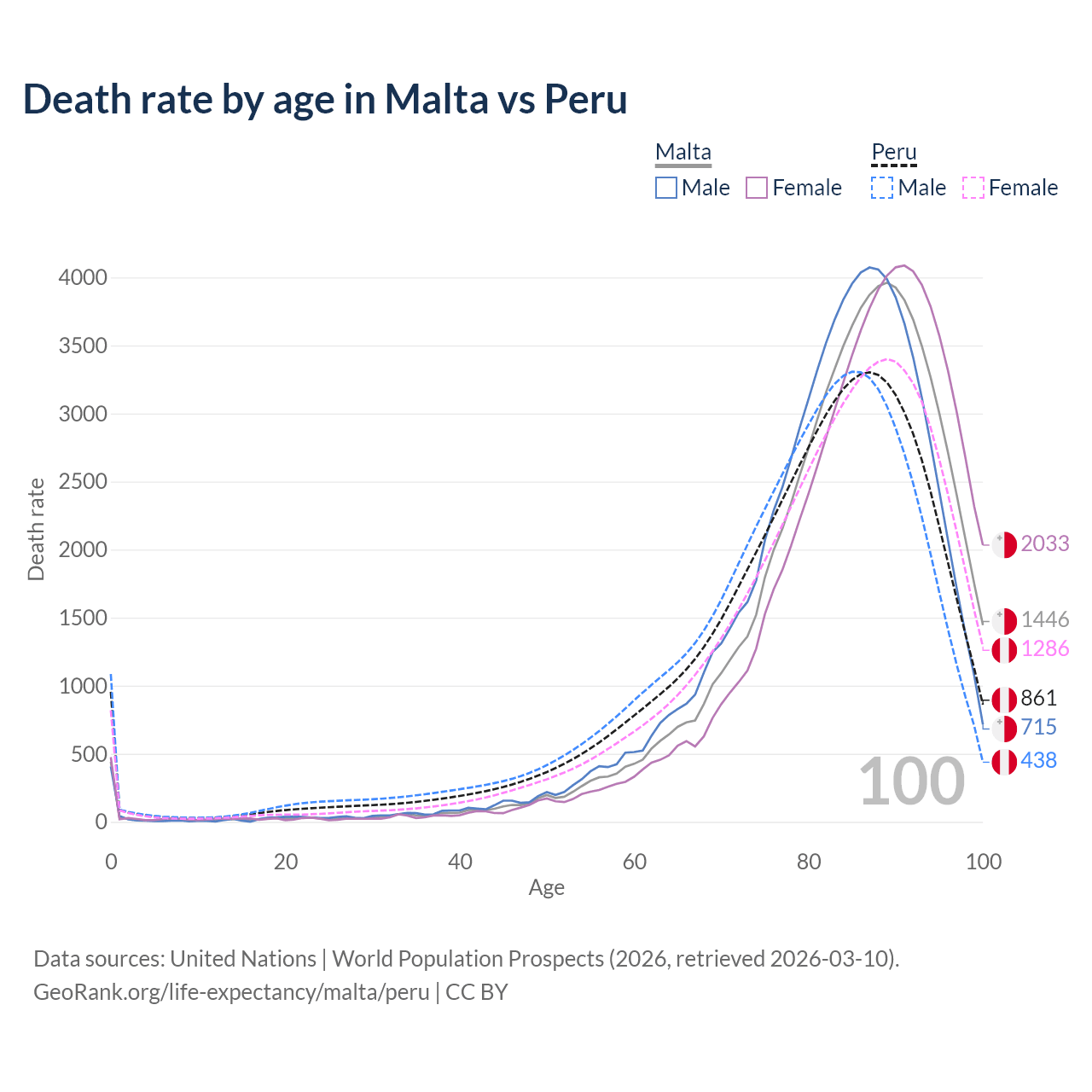 In Malta, the most common age of death is 89, compared to 87 in Peru. The median age of death is 86.3 in Malta and 82.4 in Peru, meaning only half of each cohort is expected to live past that age.