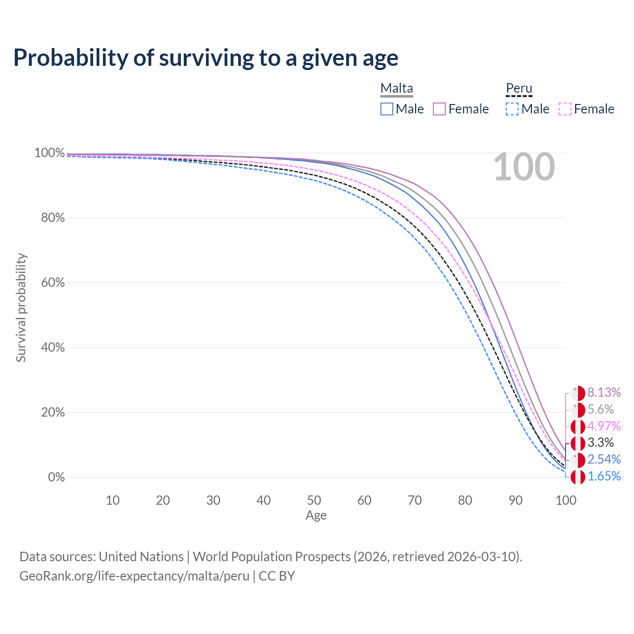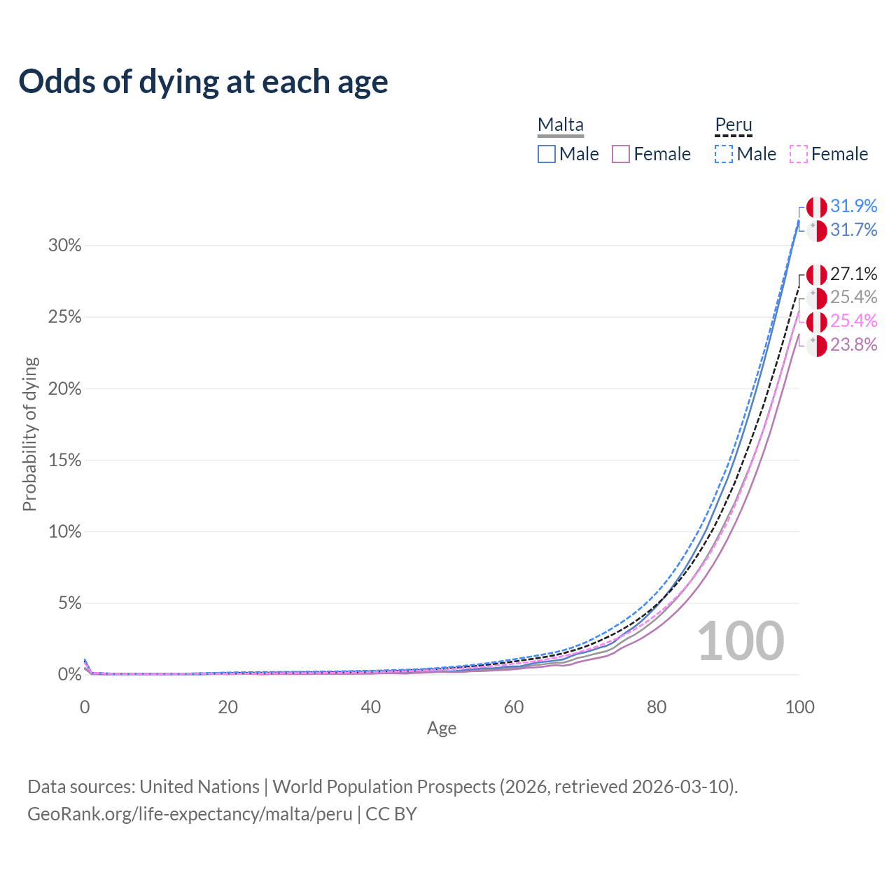 This life expectancy calculator shows the odds of living to 100, 95, 90, and below based on current age for both males and females in Malta and Peru, along with mean and median age of death. The calculations are based on the 2026 life tables (actuarial tables) from the UN World Population Prospects.