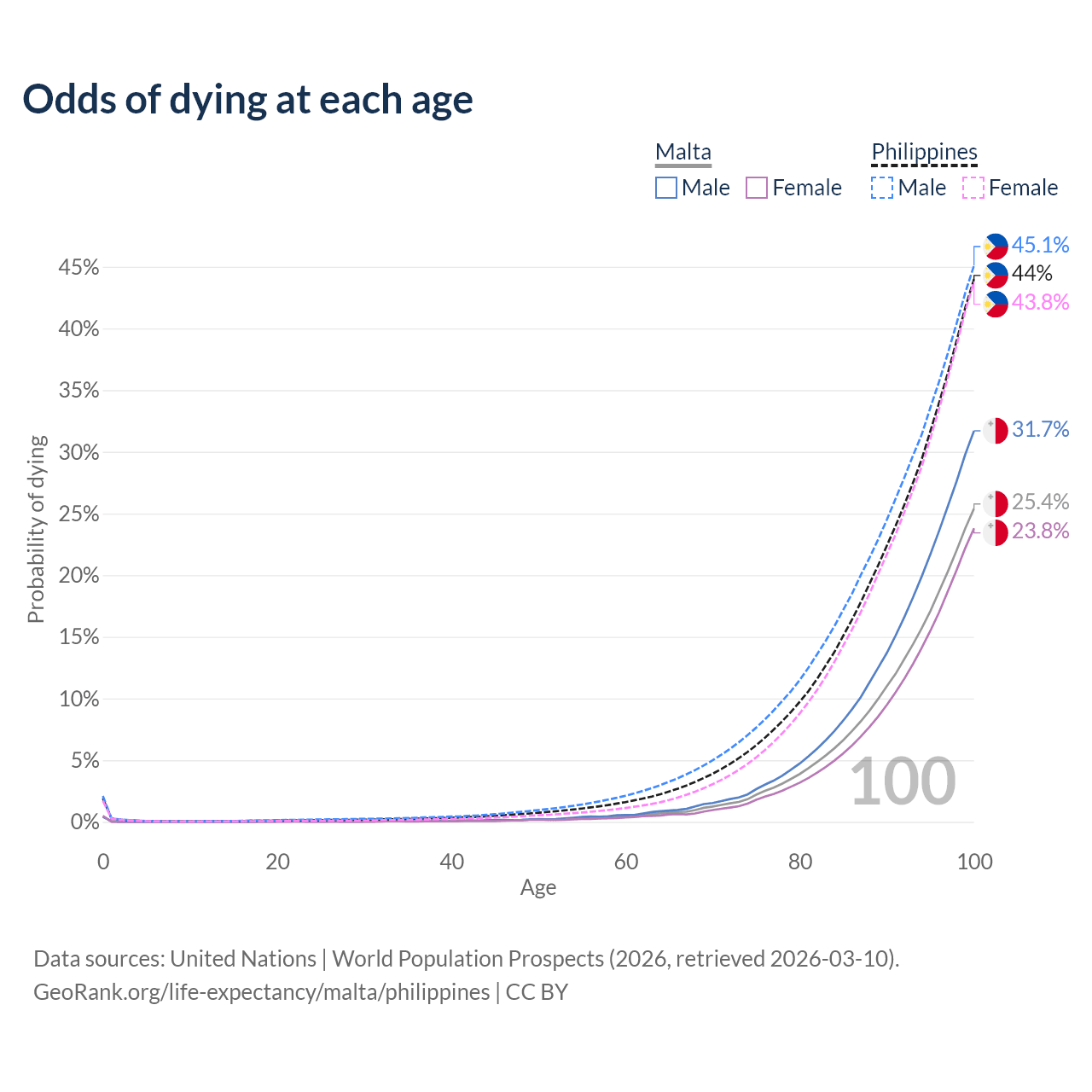 This life expectancy calculator shows the odds of living to 100, 95, 90, and below based on current age for both males and females in Malta and the Philippines, along with mean and median age of death. The calculations are based on the 2026 life tables (actuarial tables) from the UN World Population Prospects.