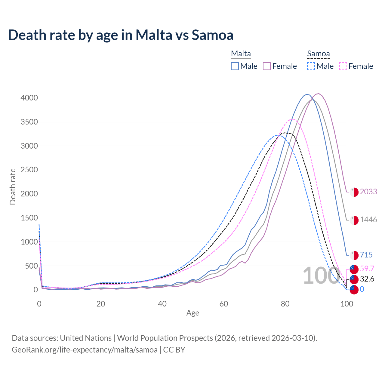 This life expectancy calculator shows the odds of living to 100, 95, 90, and below based on current age for both males and females in Malta and Samoa, along with mean and median age of death. The calculations are based on the 2026 life tables (actuarial tables) from the UN World Population Prospects.
