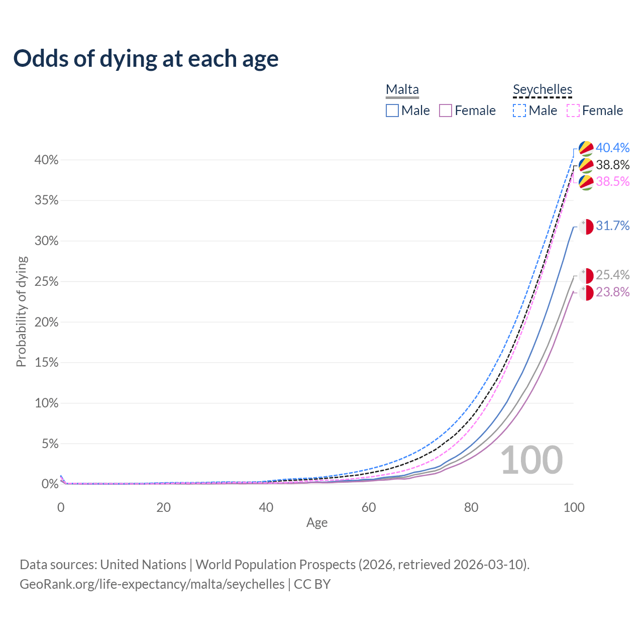 This life expectancy calculator shows the odds of living to 100, 95, 90, and below based on current age for both males and females in Malta and the Seychelles, along with mean and median age of death. The calculations are based on the 2026 life tables (actuarial tables) from the UN World Population Prospects.