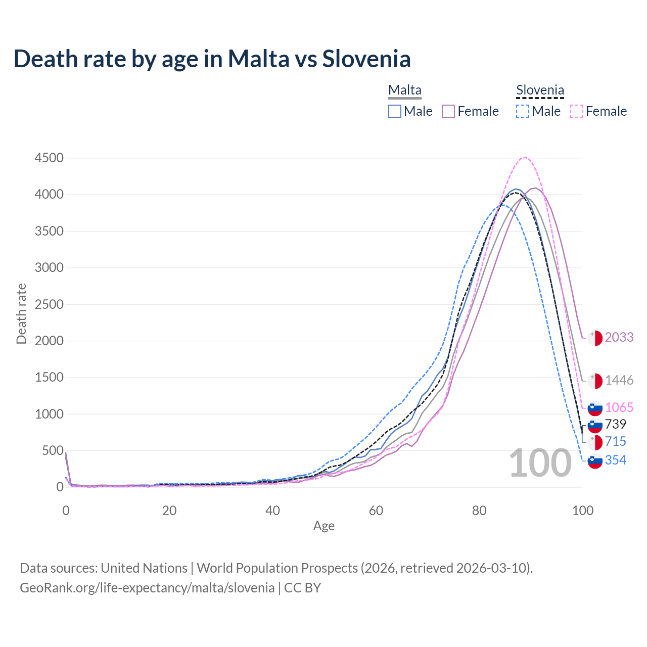 In Malta, the most common age of death is 89, compared to 87 in Slovenia. The median age of death is 86.3 in Malta and 84.4 in Slovenia, meaning only half of each cohort is expected to live past that age.