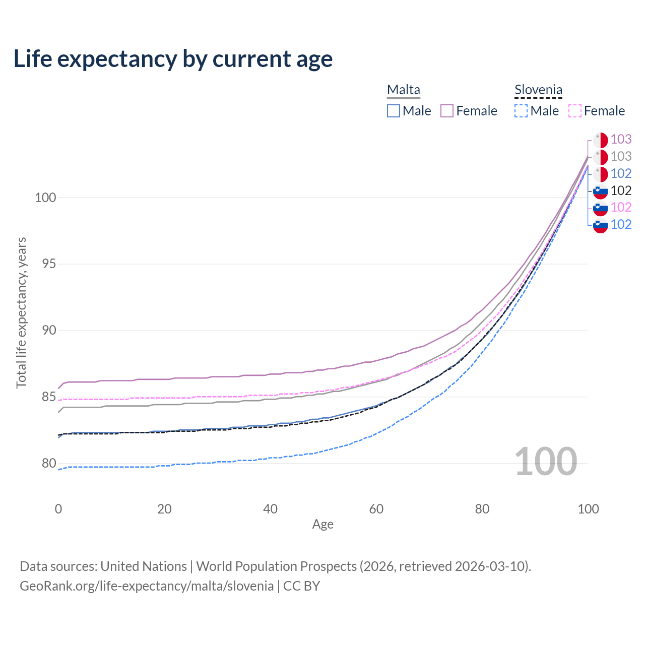 This life expectancy calculator shows the odds of living to 100, 95, 90, and below based on current age for both males and females in Malta and Slovenia, along with mean and median age of death. The calculations are based on the 2026 life tables (actuarial tables) from the UN World Population Prospects.