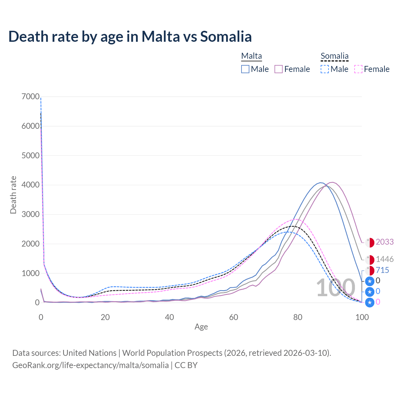 In Malta, the most common age of death is 89, compared to 0 in Somalia. The median age of death is 86.3 in Malta and 69 in Somalia, meaning only half of each cohort is expected to live past that age.