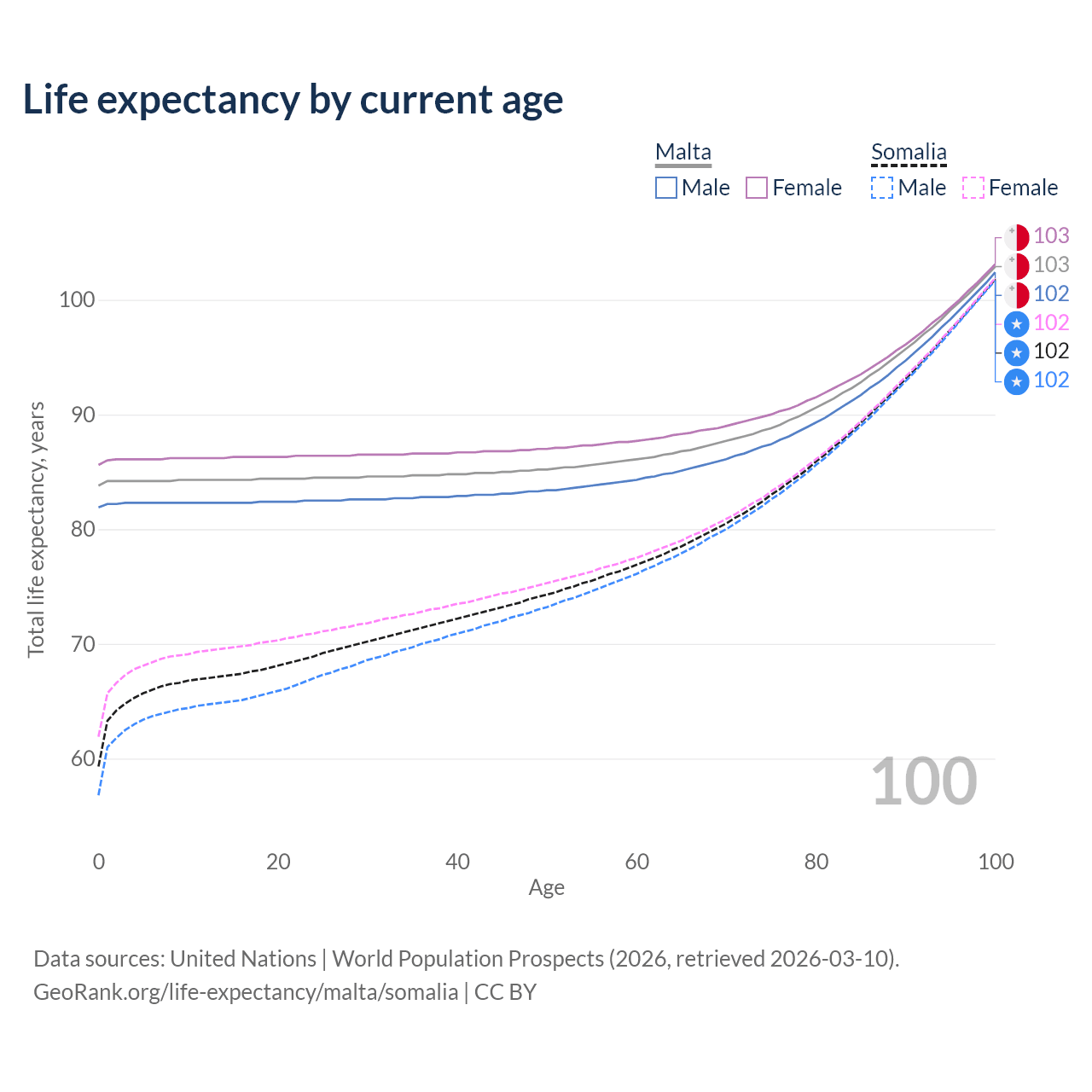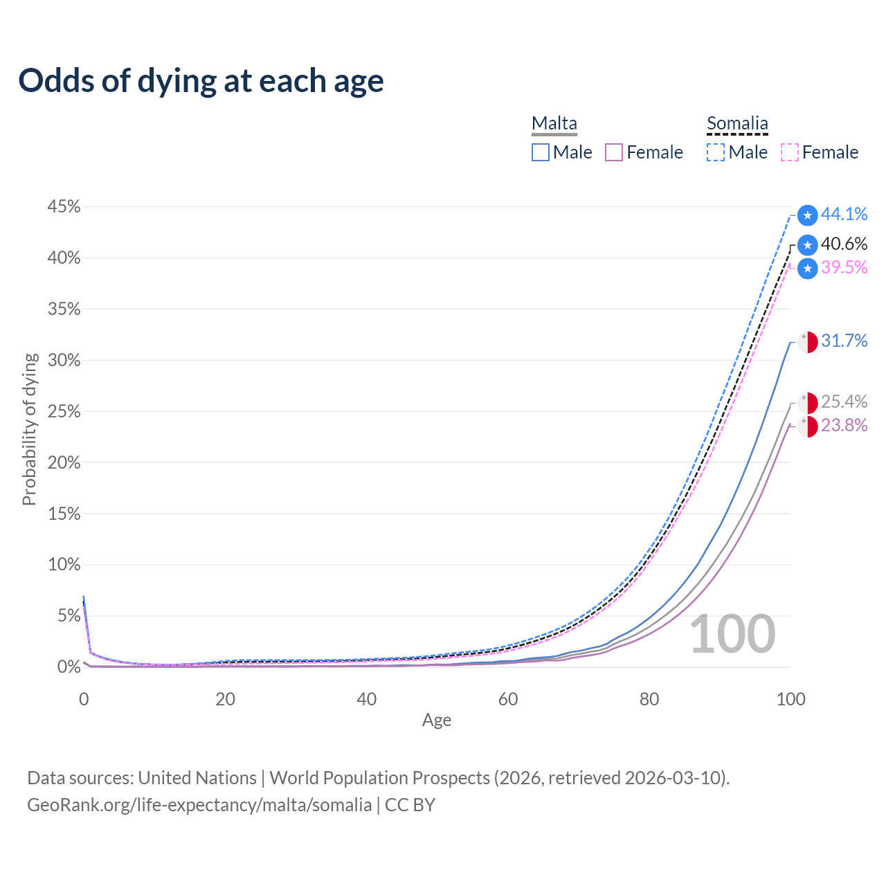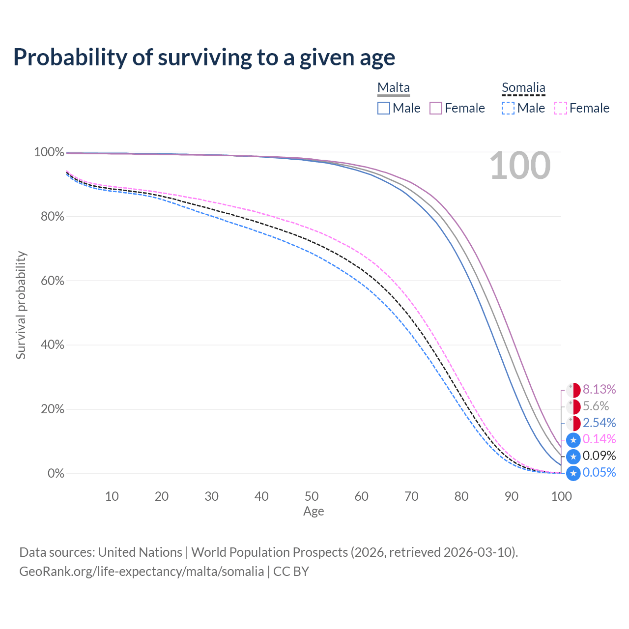 This life expectancy calculator shows the odds of living to 100, 95, 90, and below based on current age for both males and females in Malta and Somalia, along with mean and median age of death. The calculations are based on the 2026 life tables (actuarial tables) from the UN World Population Prospects.