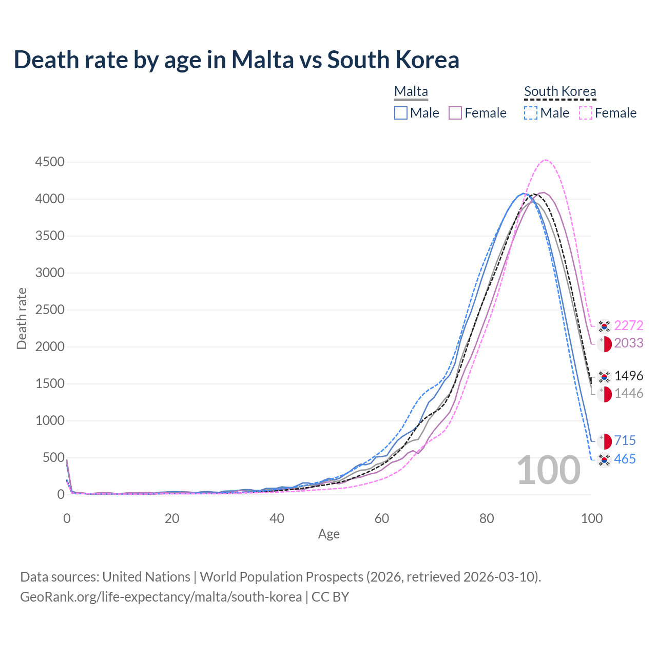 This life expectancy calculator shows the odds of living to 100, 95, 90, and below based on current age for both males and females in Malta and South Korea, along with mean and median age of death. The calculations are based on the 2026 life tables (actuarial tables) from the UN World Population Prospects.