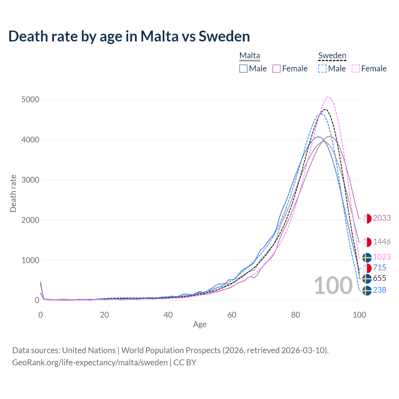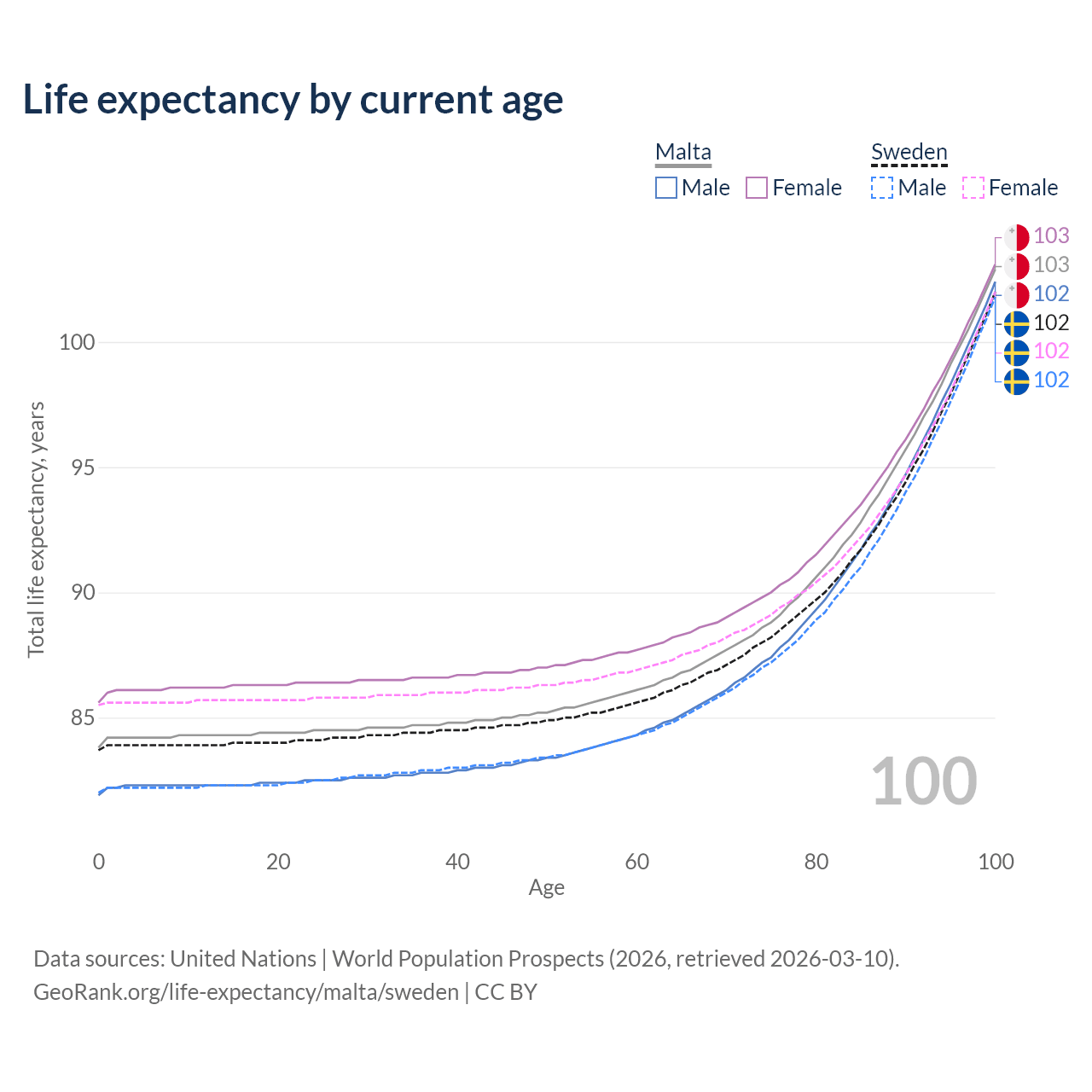 This life expectancy calculator shows the odds of living to 100, 95, 90, and below based on current age for both males and females in Malta and Sweden, along with mean and median age of death. The calculations are based on the 2026 life tables (actuarial tables) from the UN World Population Prospects.