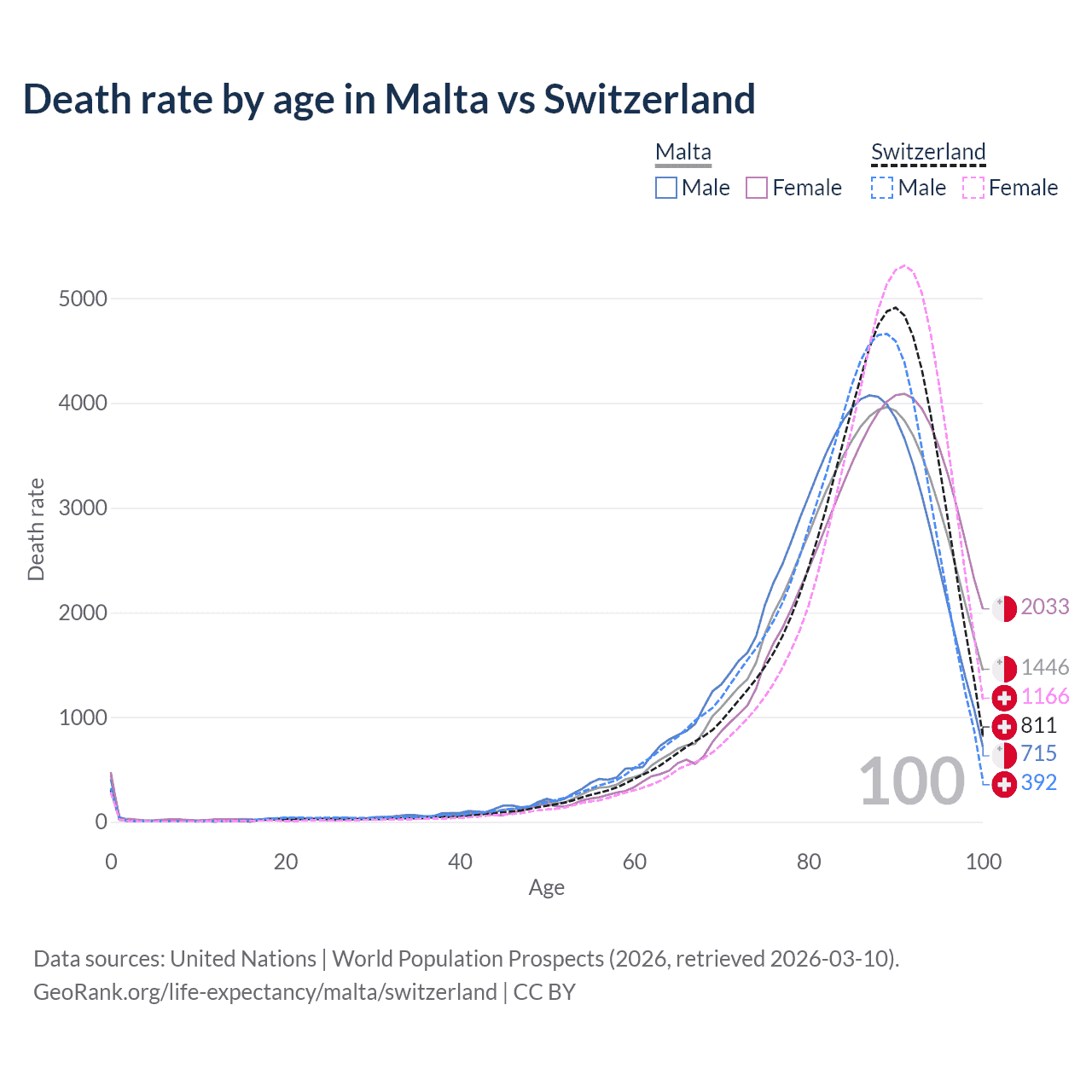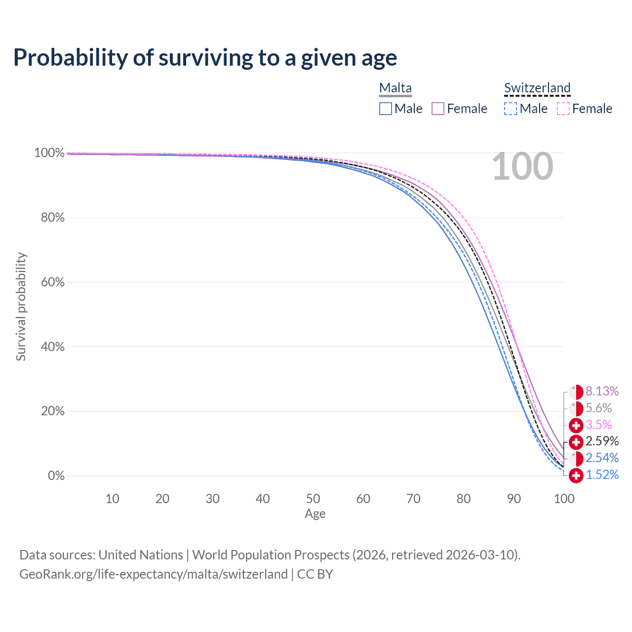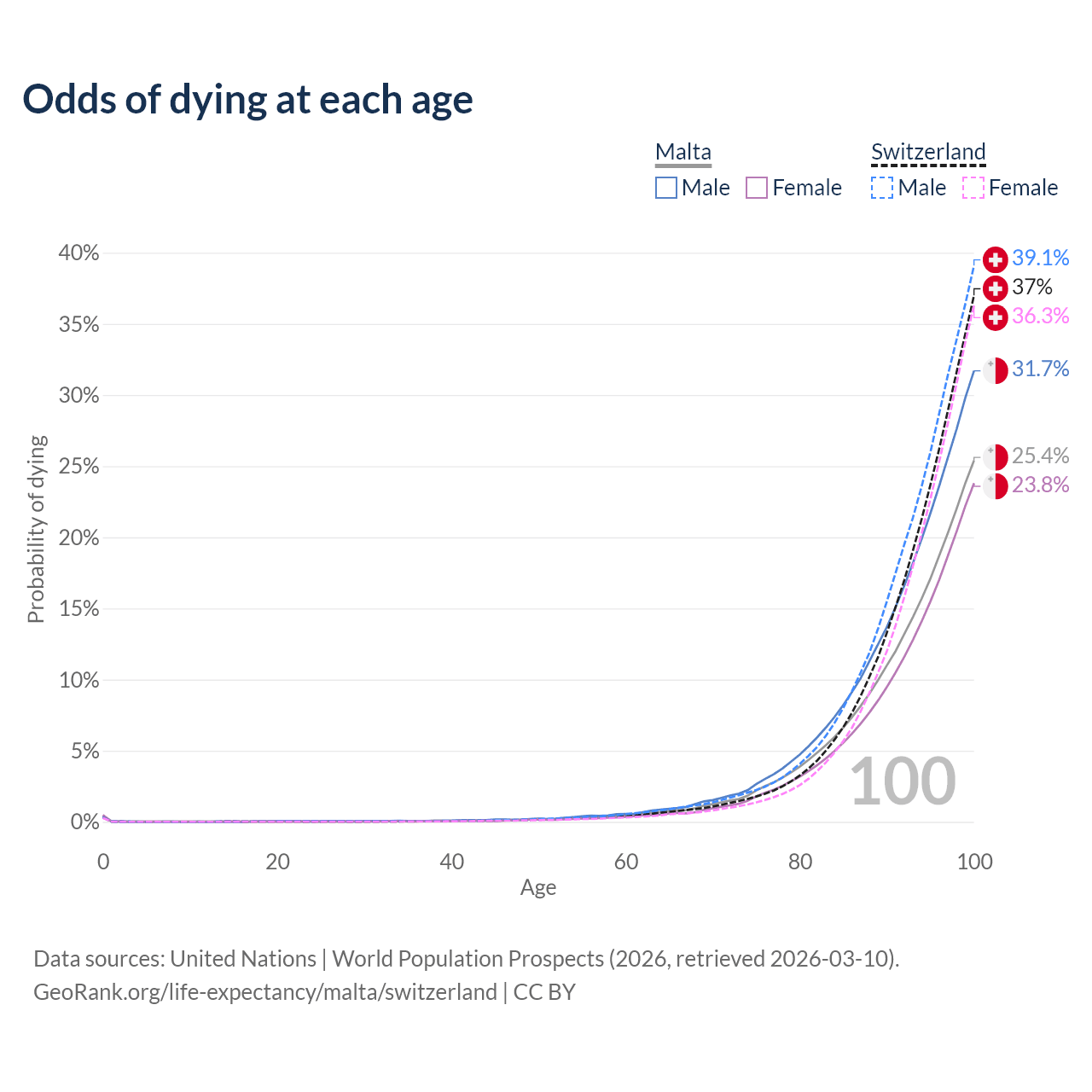 This life expectancy calculator shows the odds of living to 100, 95, 90, and below based on current age for both males and females in Malta and Switzerland, along with mean and median age of death. The calculations are based on the 2026 life tables (actuarial tables) from the UN World Population Prospects.