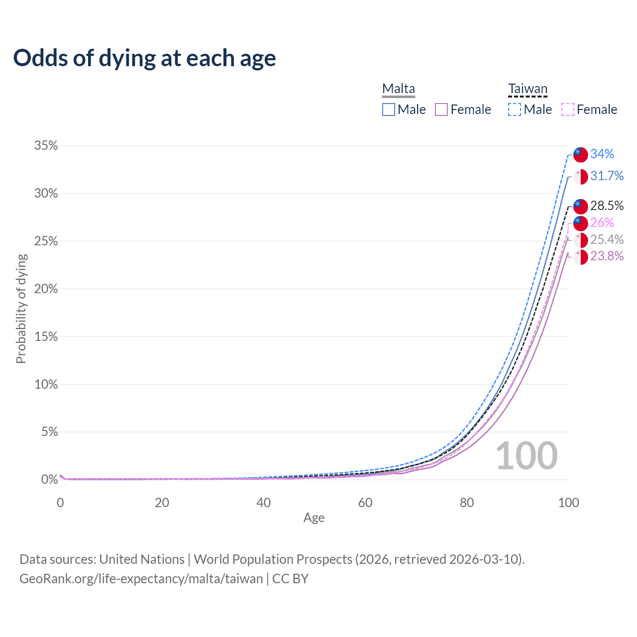 This life expectancy calculator shows the odds of living to 100, 95, 90, and below based on current age for both males and females in Malta and Taiwan, along with mean and median age of death. The calculations are based on the 2026 life tables (actuarial tables) from the UN World Population Prospects.