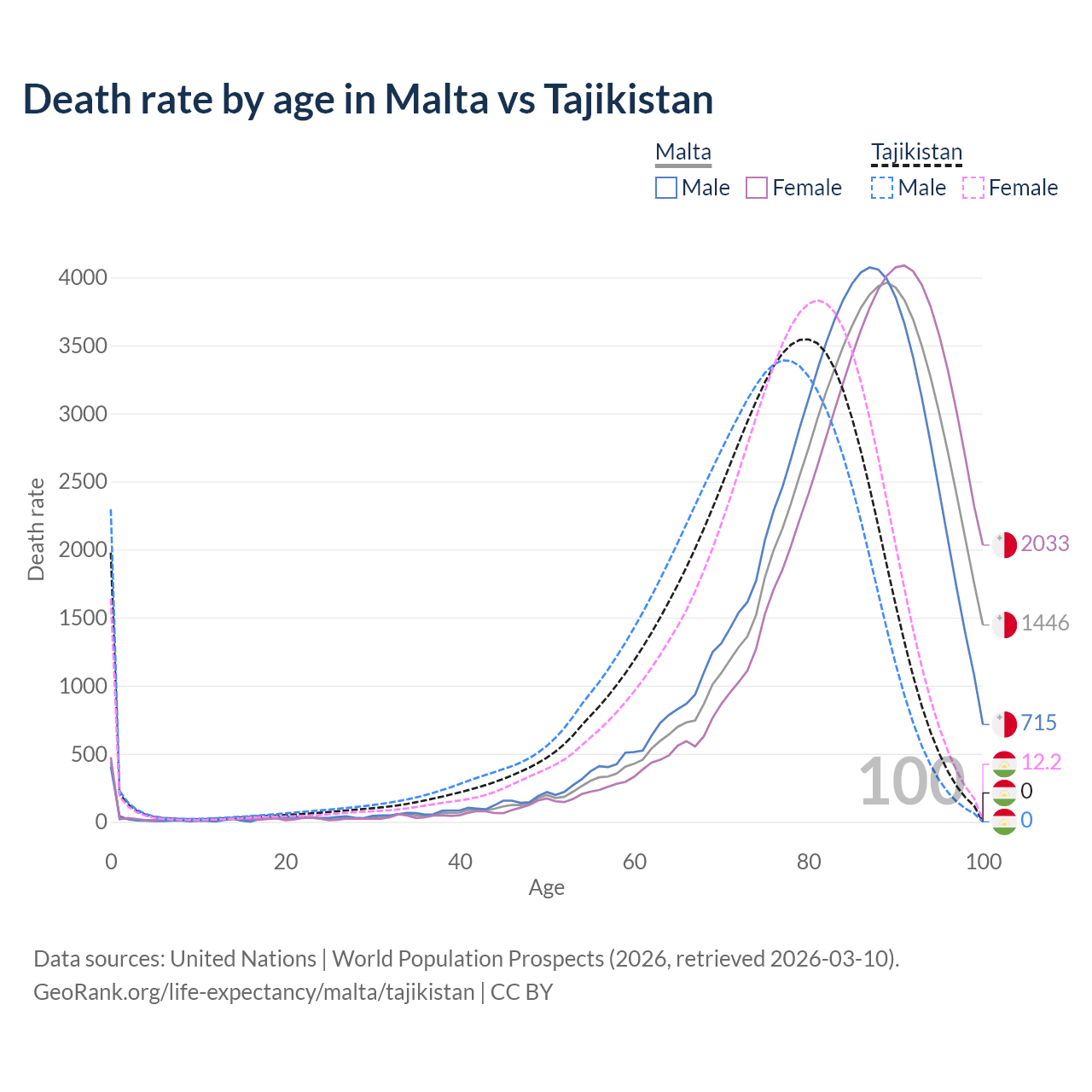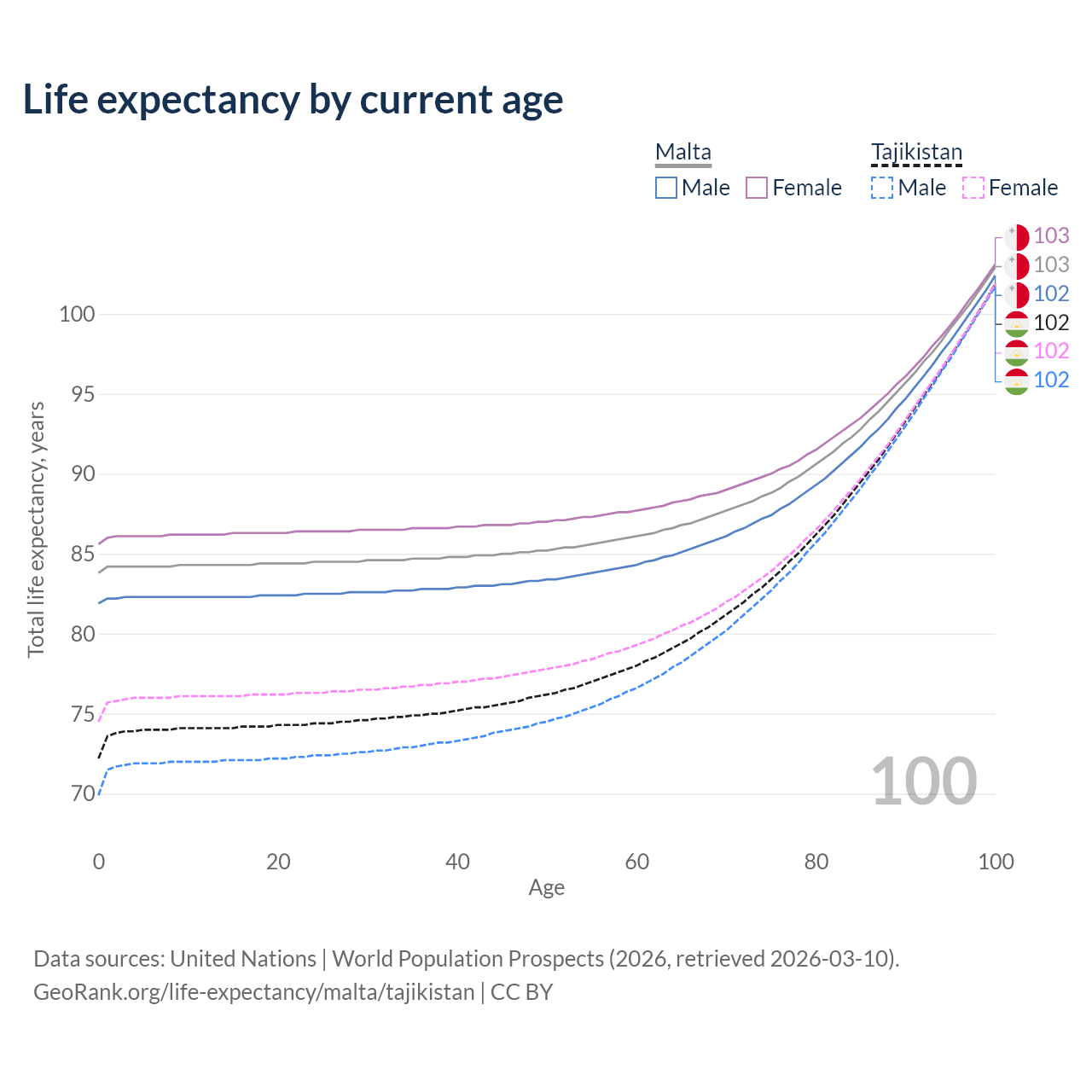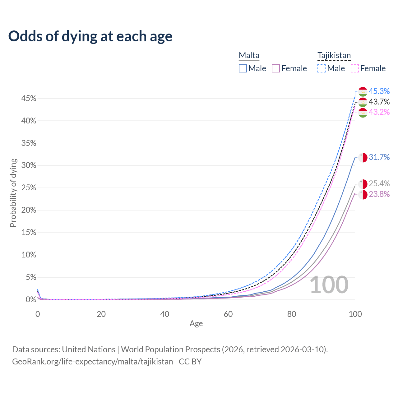 This life expectancy calculator shows the odds of living to 100, 95, 90, and below based on current age for both males and females in Malta and Tajikistan, along with mean and median age of death. The calculations are based on the 2026 life tables (actuarial tables) from the UN World Population Prospects.