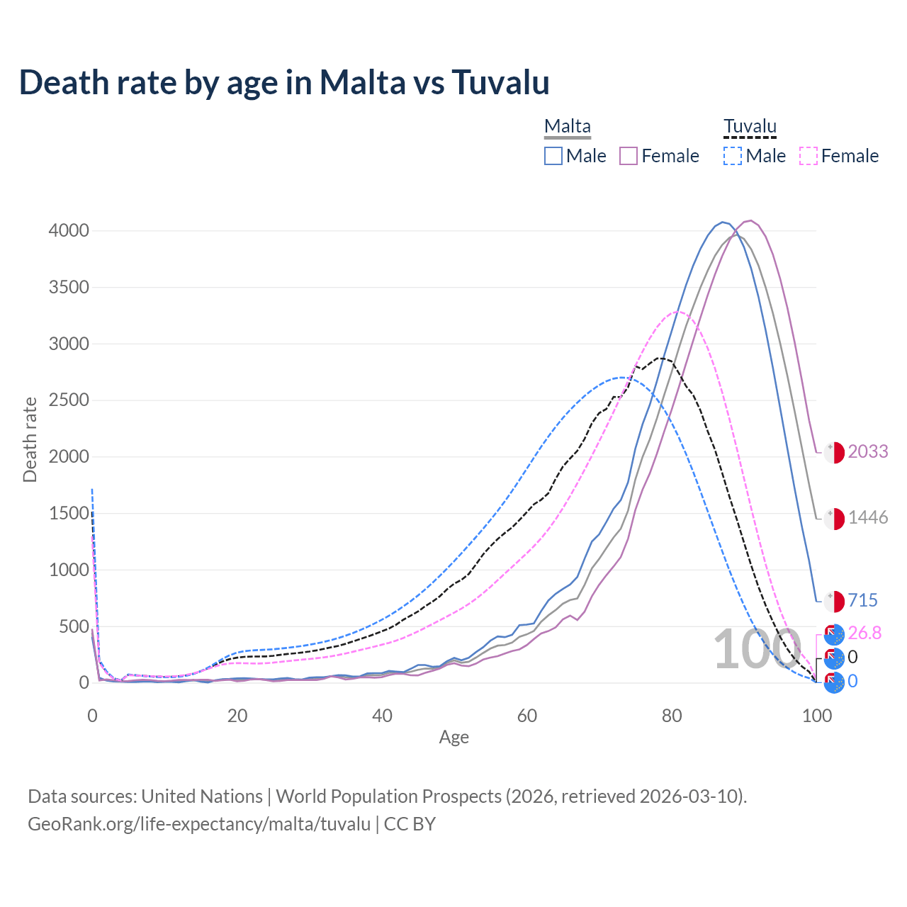In Malta, the most common age of death is 89, compared to 78 in Tuvalu. The median age of death is 86.3 in Malta and 71.9 in Tuvalu, meaning only half of each cohort is expected to live past that age.