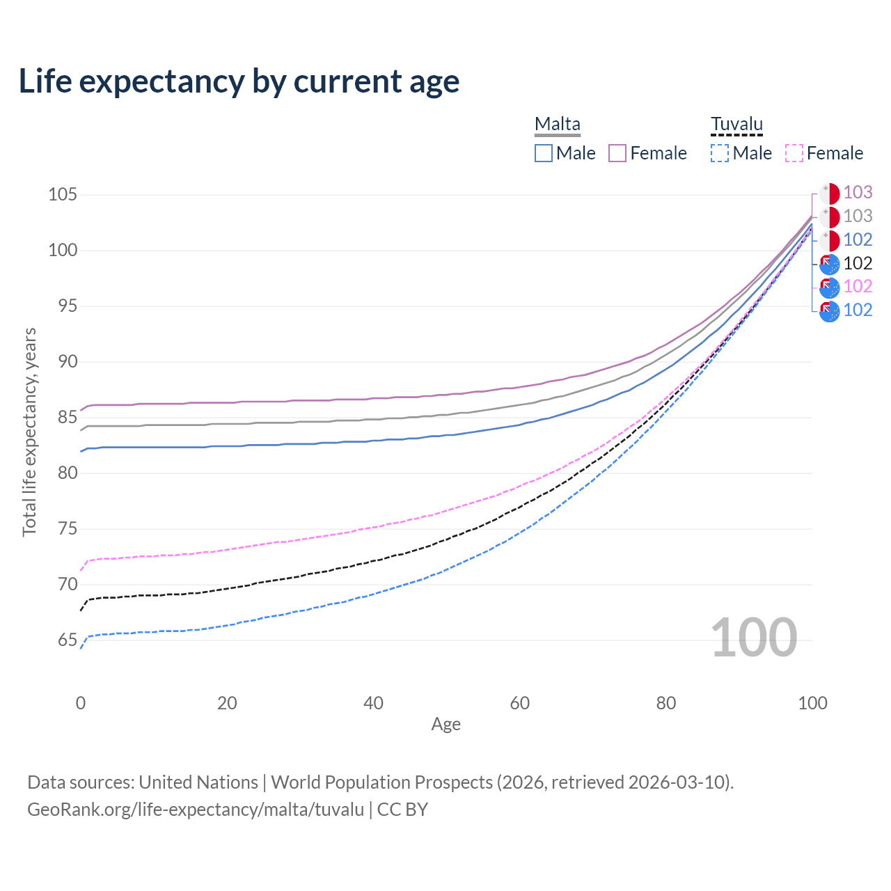 This life expectancy calculator shows the odds of living to 100, 95, 90, and below based on current age for both males and females in Malta and Tuvalu, along with mean and median age of death. The calculations are based on the 2026 life tables (actuarial tables) from the UN World Population Prospects.