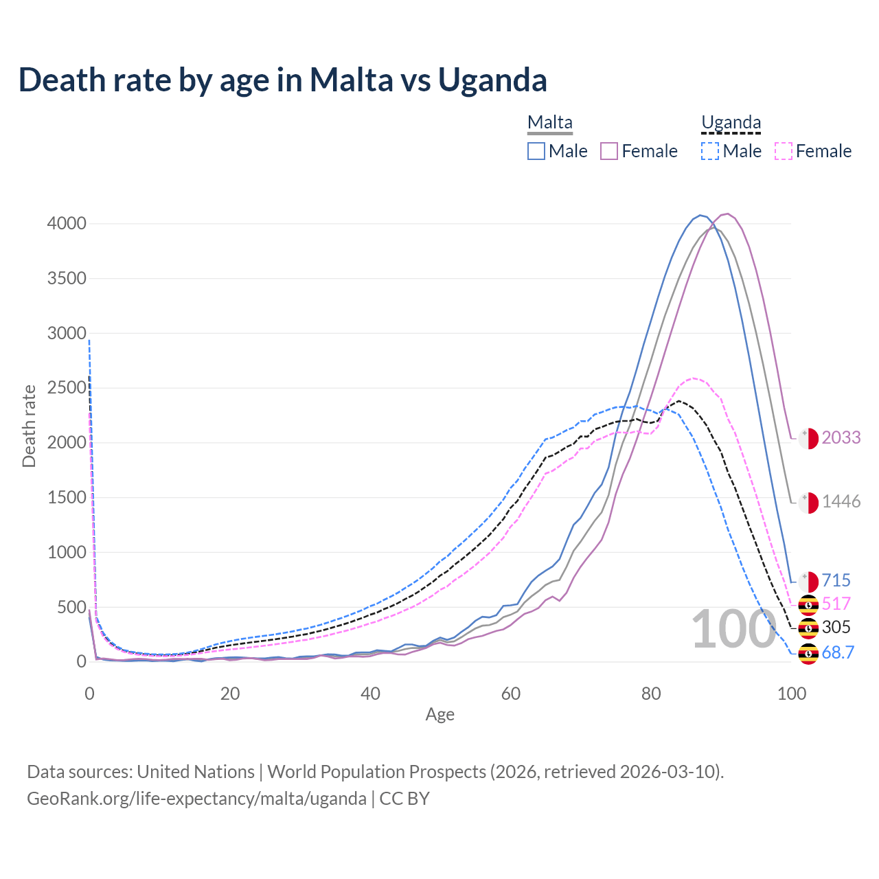 In Malta, the most common age of death is 89, compared to 0 in Uganda. The median age of death is 86.3 in Malta and 73.3 in Uganda, meaning only half of each cohort is expected to live past that age.