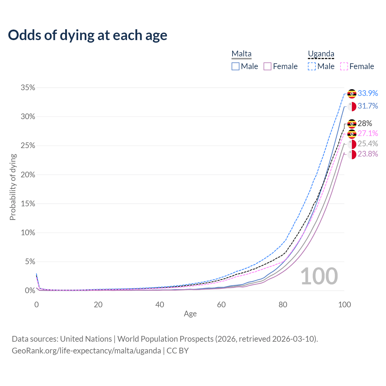 This life expectancy calculator shows the odds of living to 100, 95, 90, and below based on current age for both males and females in Malta and Uganda, along with mean and median age of death. The calculations are based on the 2026 life tables (actuarial tables) from the UN World Population Prospects.