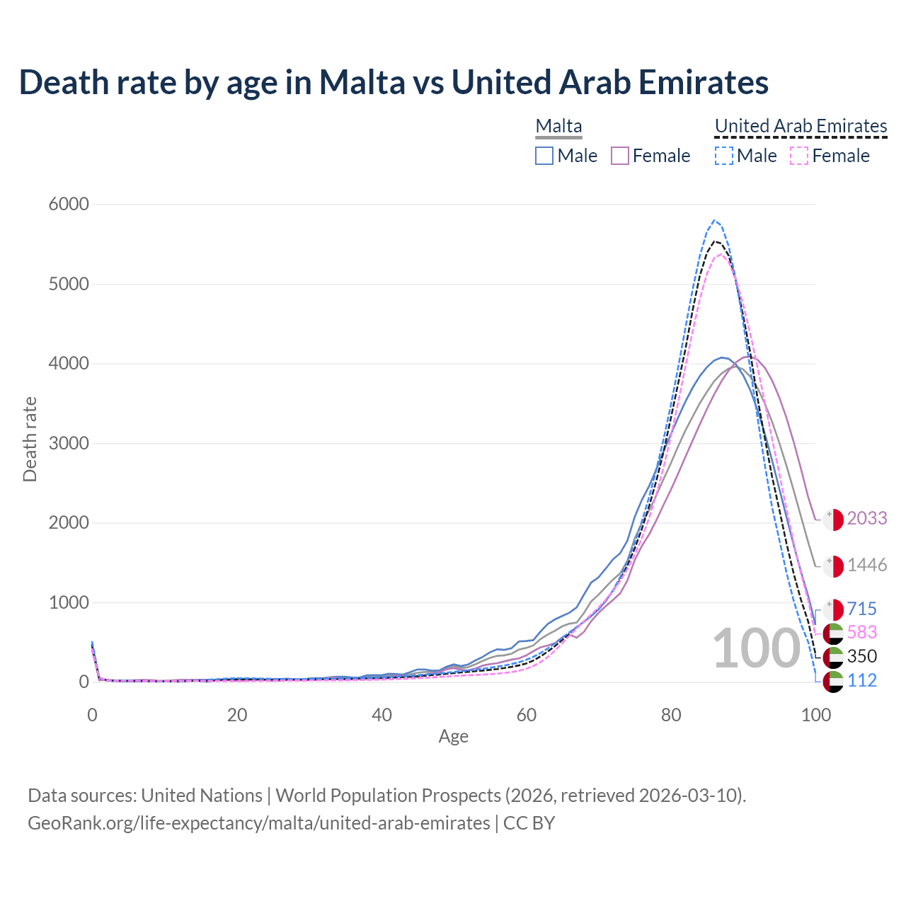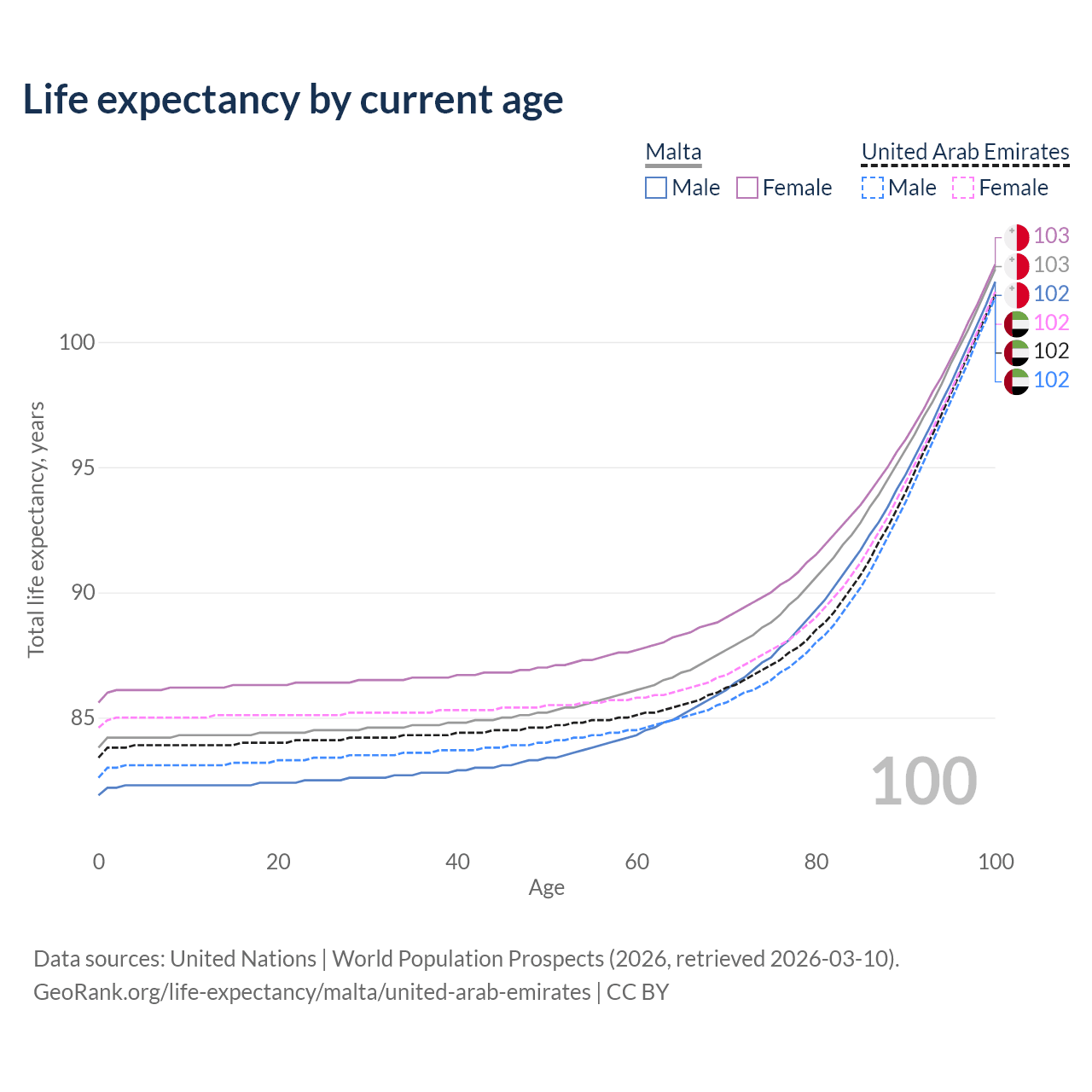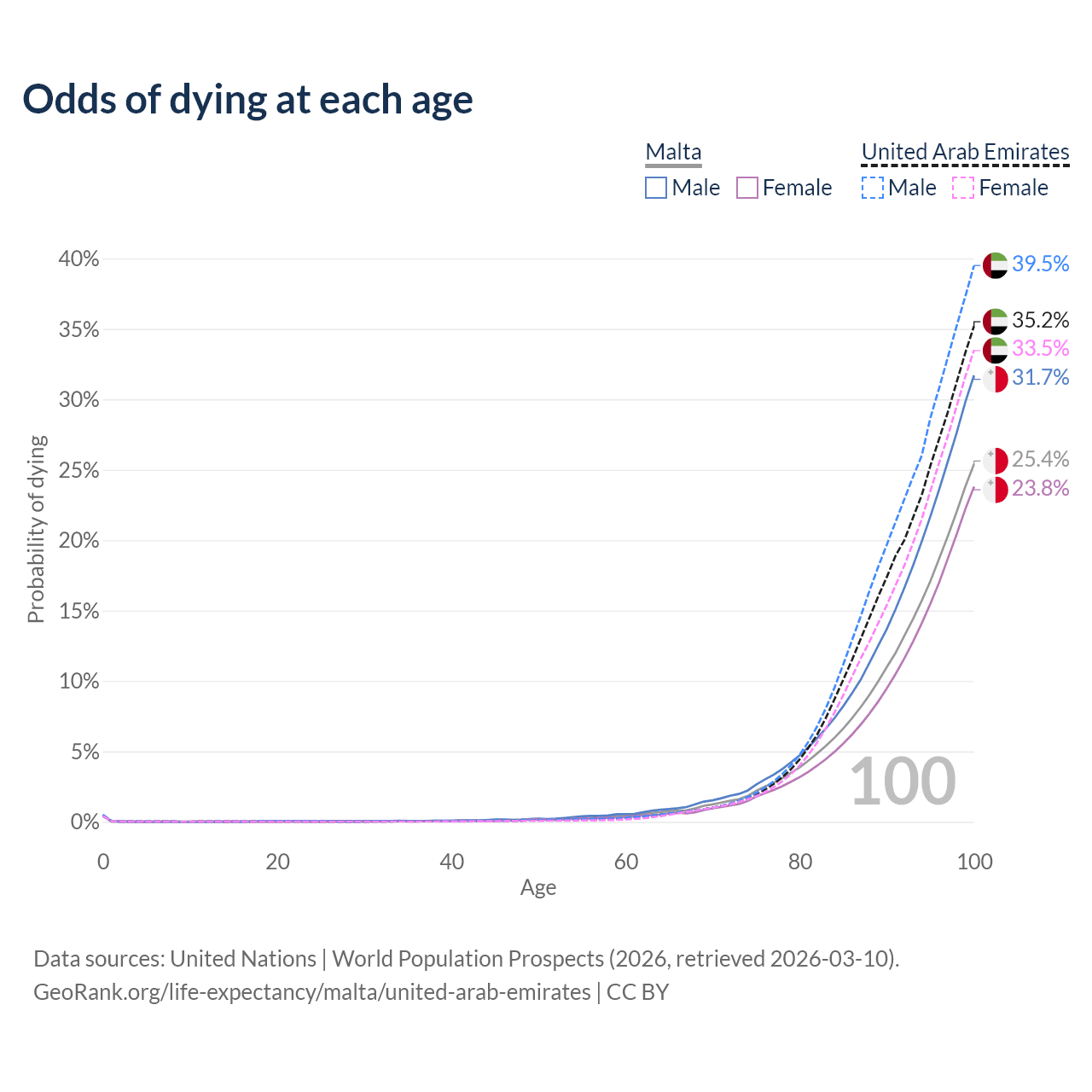 This life expectancy calculator shows the odds of living to 100, 95, 90, and below based on current age for both males and females in Malta and the United Arab Emirates, along with mean and median age of death. The calculations are based on the 2026 life tables (actuarial tables) from the UN World Population Prospects.