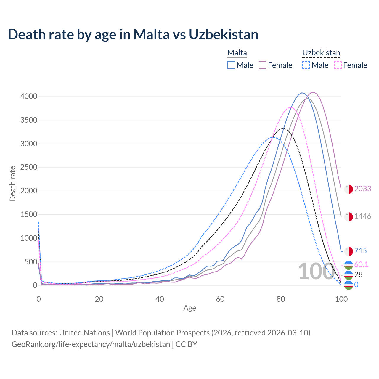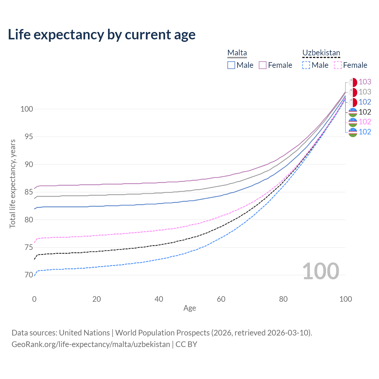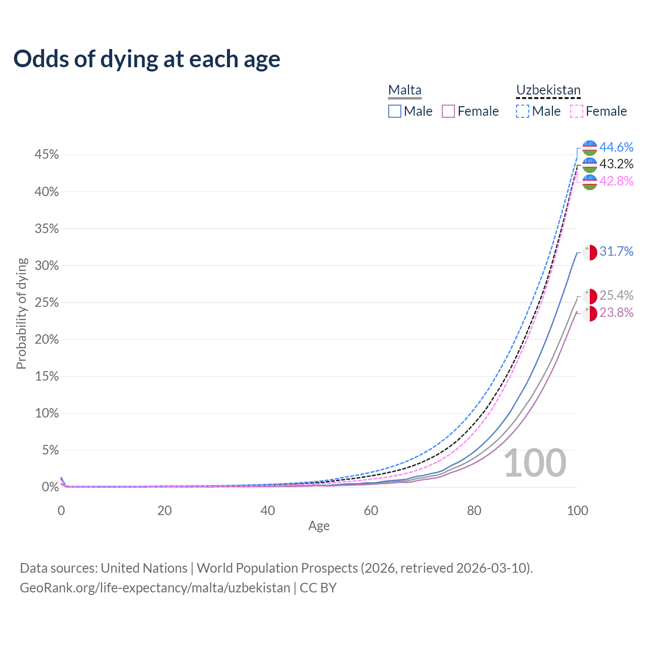 This life expectancy calculator shows the odds of living to 100, 95, 90, and below based on current age for both males and females in Malta and Uzbekistan, along with mean and median age of death. The calculations are based on the 2026 life tables (actuarial tables) from the UN World Population Prospects.