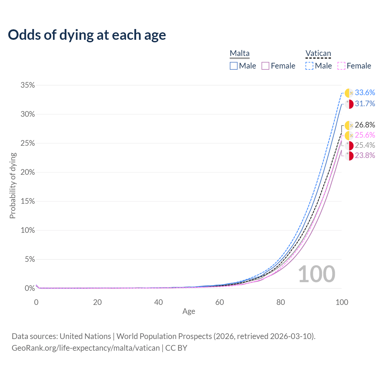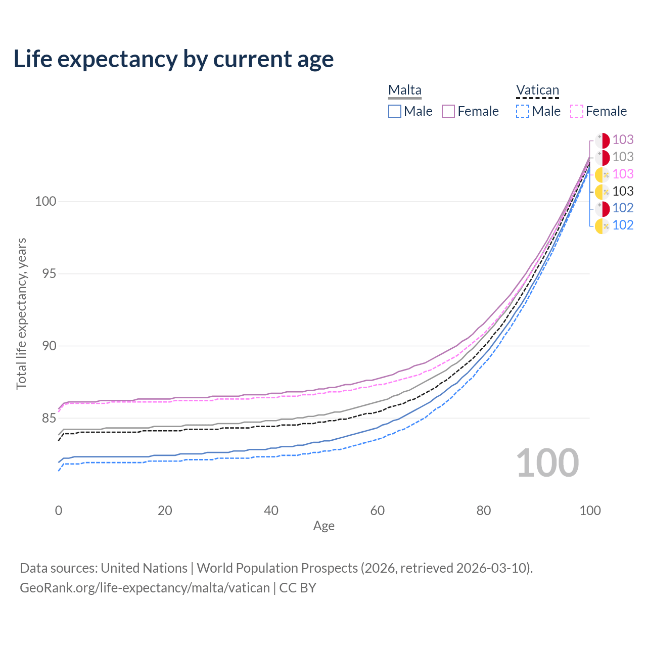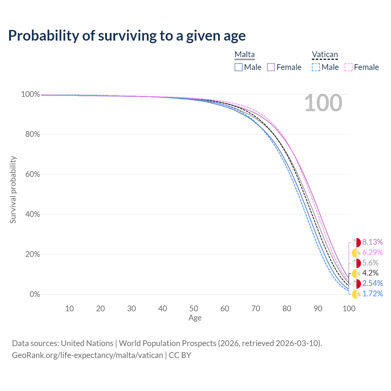 This life expectancy calculator shows the odds of living to 100, 95, 90, and below based on current age for both males and females in Malta and the Vatican, along with mean and median age of death. The calculations are based on the 2026 life tables (actuarial tables) from the UN World Population Prospects.