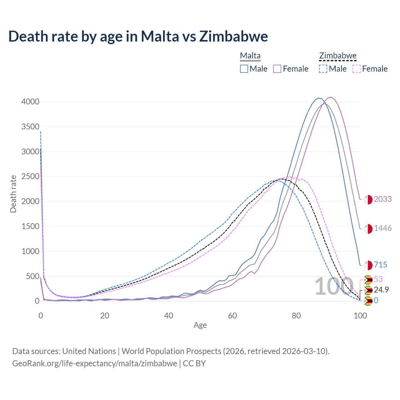 In Malta, the most common age of death is 89, compared to 0 in Zimbabwe. The median age of death is 86.3 in Malta and 68.8 in Zimbabwe, meaning only half of each cohort is expected to live past that age.