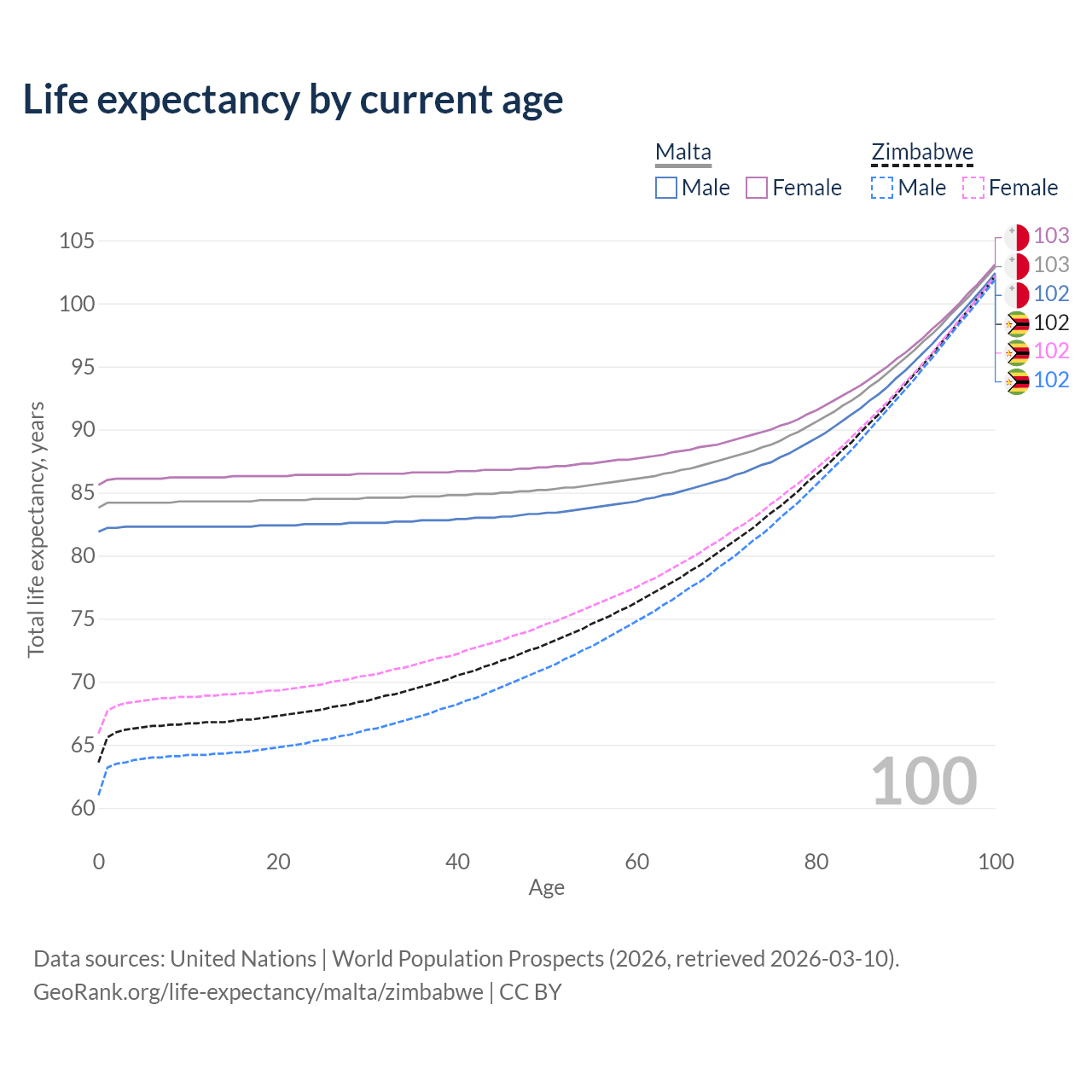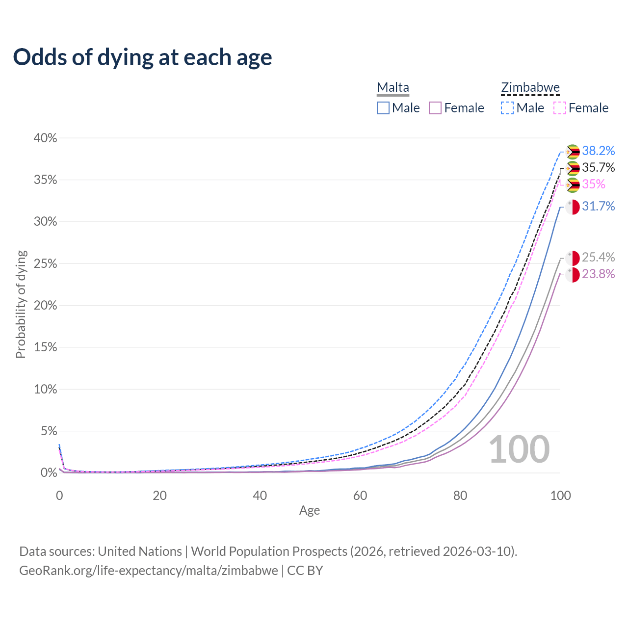 This life expectancy calculator shows the odds of living to 100, 95, 90, and below based on current age for both males and females in Malta and Zimbabwe, along with mean and median age of death. The calculations are based on the 2026 life tables (actuarial tables) from the UN World Population Prospects.
