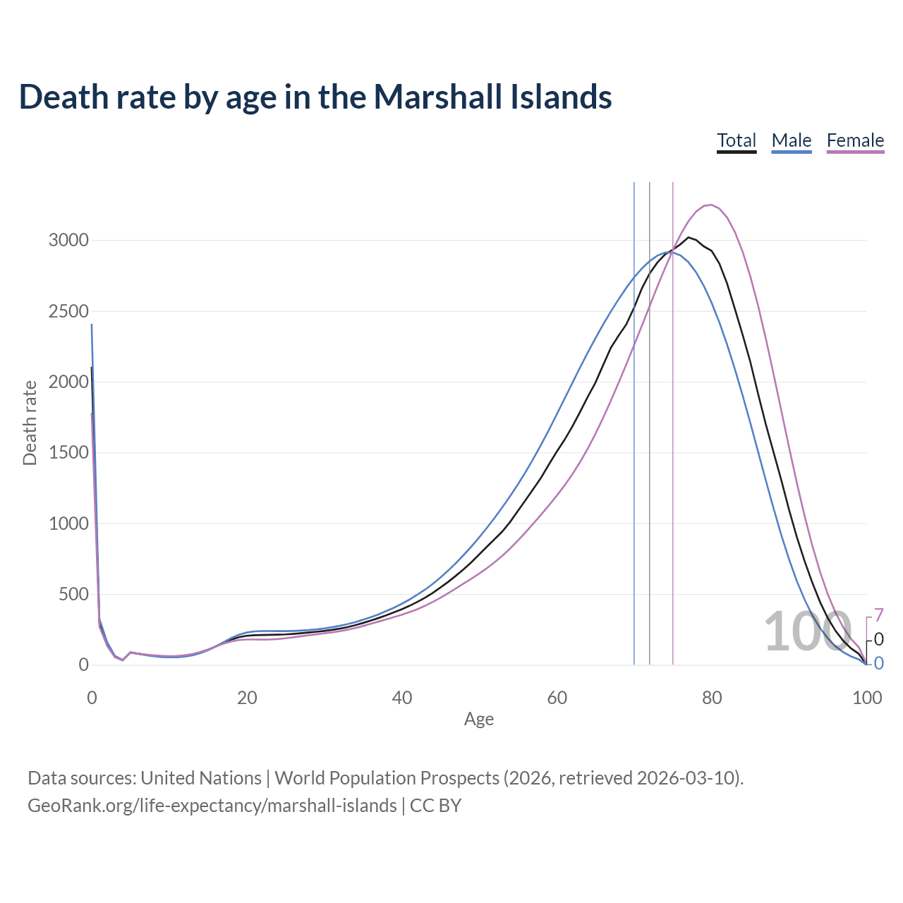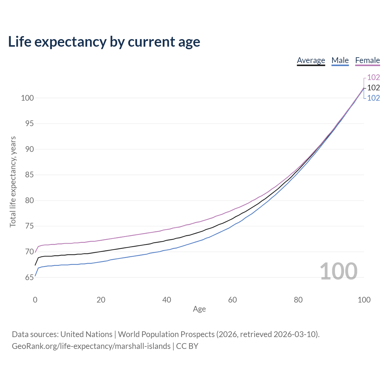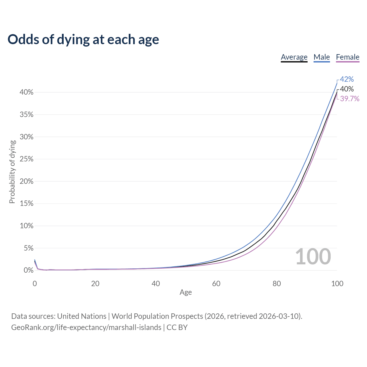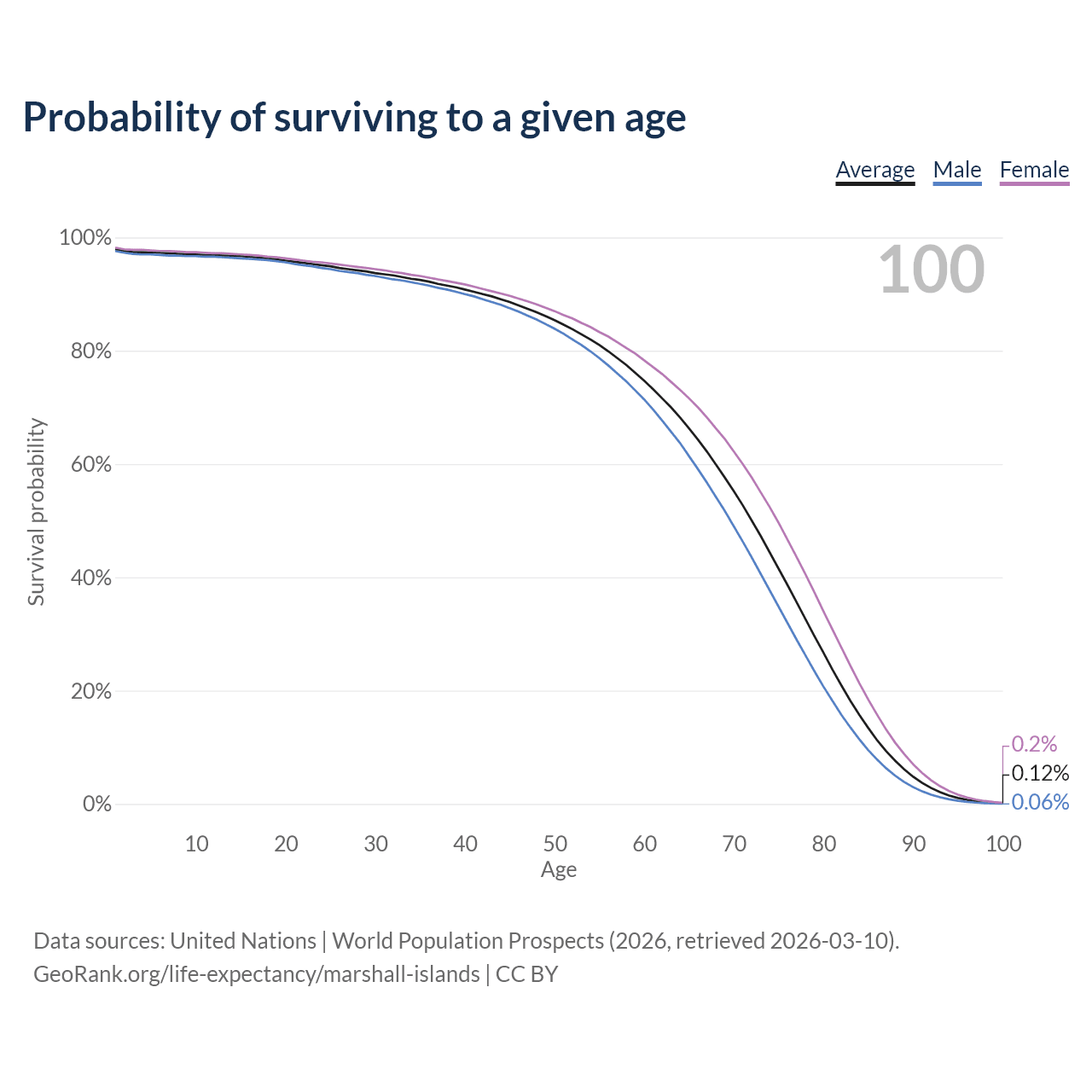 This life expectancy calculator shows the odds of living to 100, 95, 90, and below based on current age for both males and females in the Marshall Islands, along with mean and median age of death. The calculations are based on the 2026 life tables (actuarial tables) from the UN World Population Prospects.
