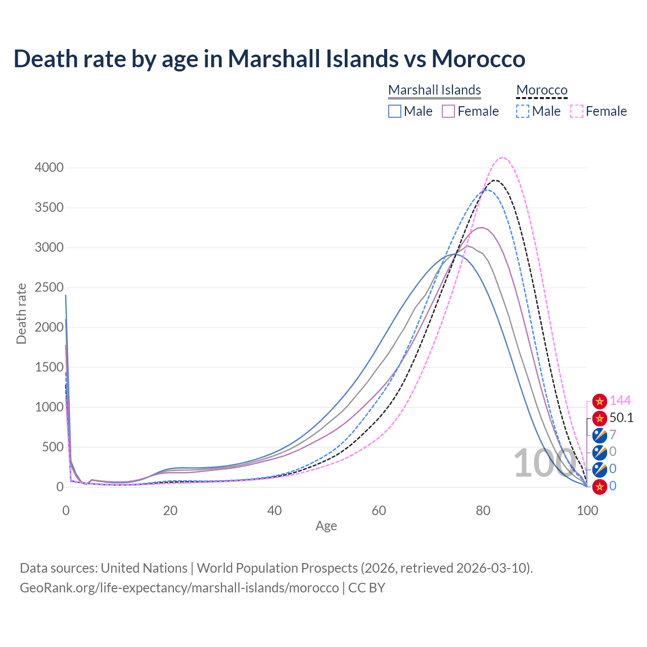 In the Marshall Islands, the most common age of death is 77, compared to 82 in Morocco. The median age of death is 72 in the Marshall Islands and 79.3 in Morocco, meaning only half of each cohort is expected to live past that age.