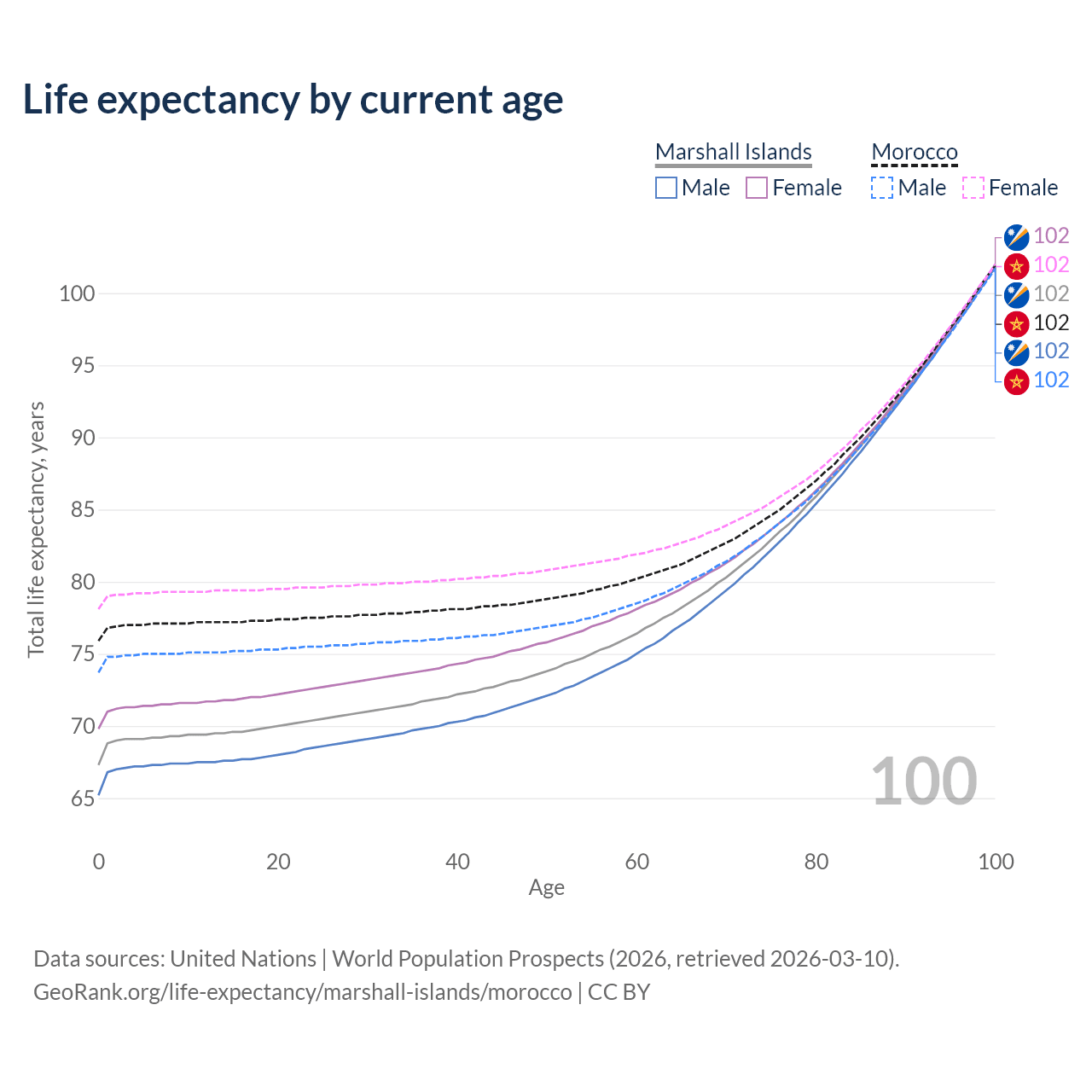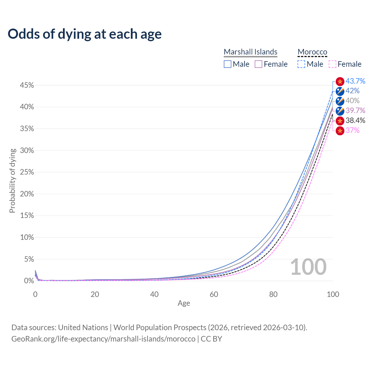 This life expectancy calculator shows the odds of living to 100, 95, 90, and below based on current age for both males and females in the Marshall Islands and Morocco, along with mean and median age of death. The calculations are based on the 2026 life tables (actuarial tables) from the UN World Population Prospects.