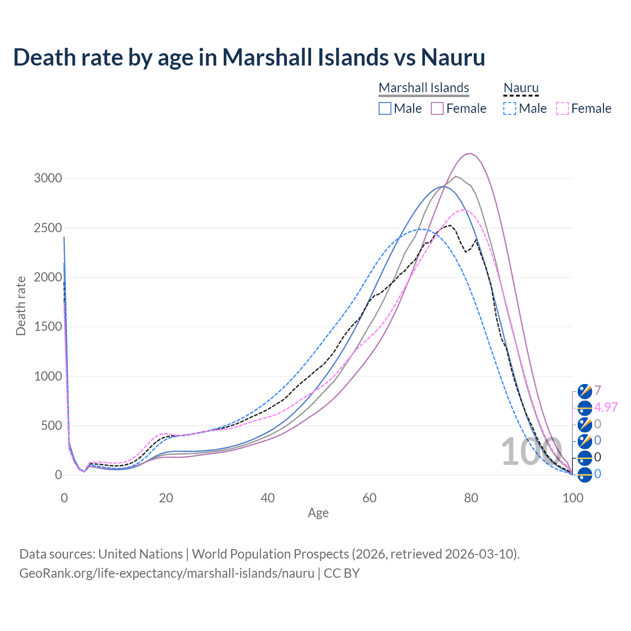 In the Marshall Islands, the most common age of death is 77, compared to 76 in Nauru. The median age of death is 72 in the Marshall Islands and 67.3 in Nauru, meaning only half of each cohort is expected to live past that age.