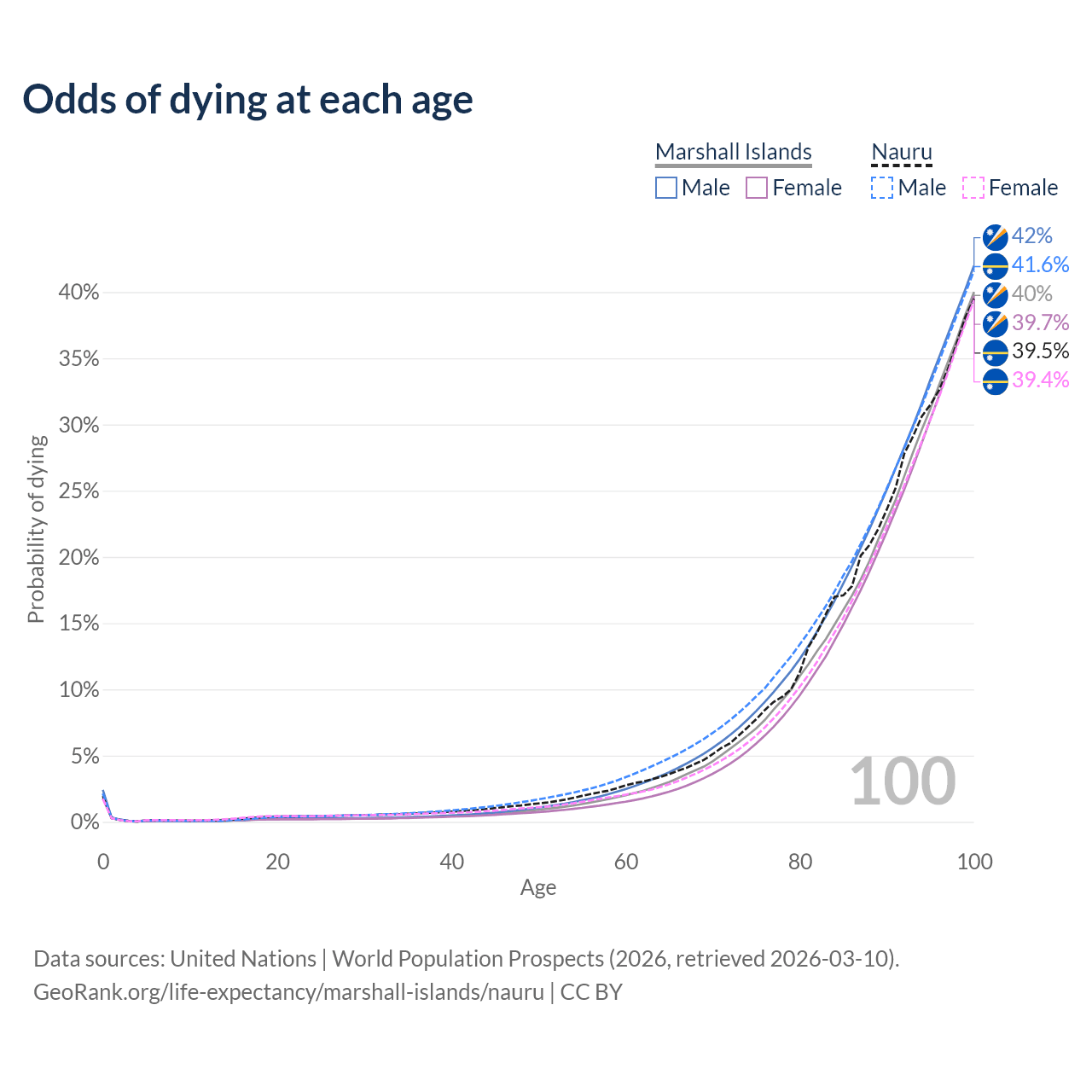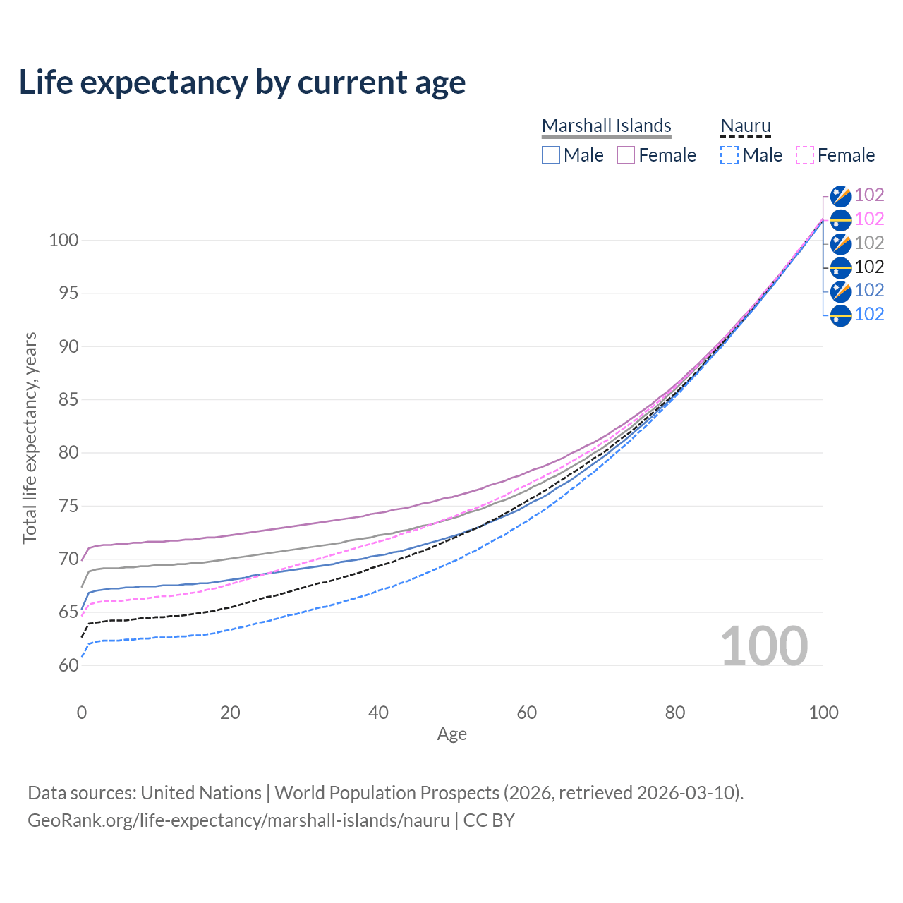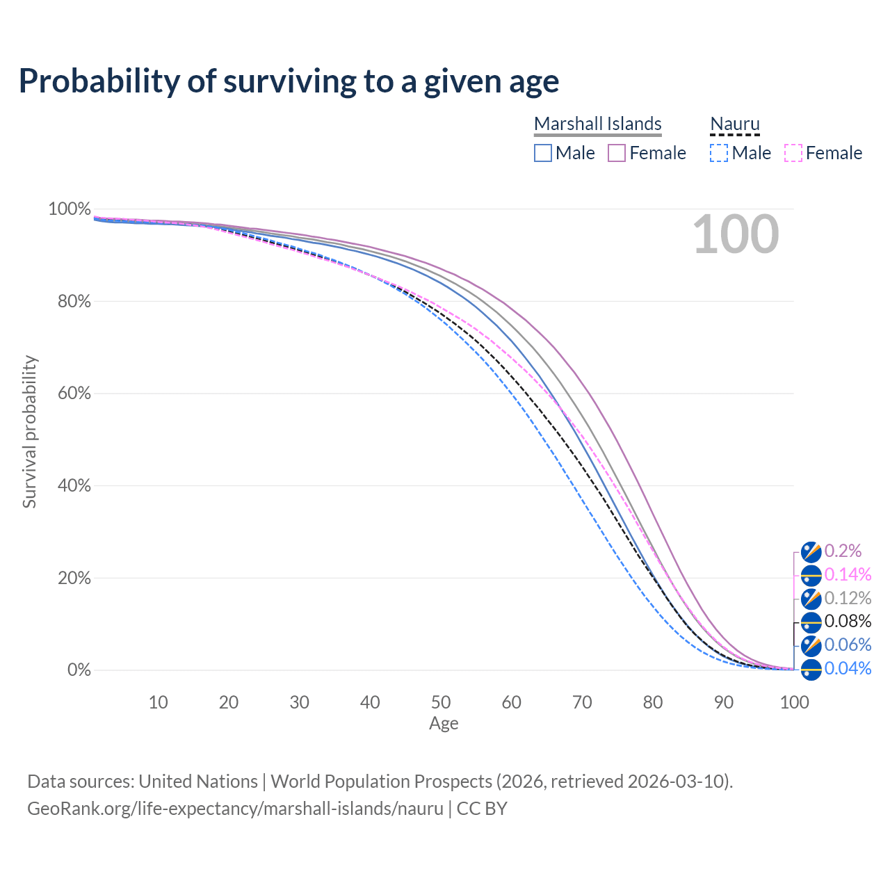 This life expectancy calculator shows the odds of living to 100, 95, 90, and below based on current age for both males and females in the Marshall Islands and Nauru, along with mean and median age of death. The calculations are based on the 2026 life tables (actuarial tables) from the UN World Population Prospects.