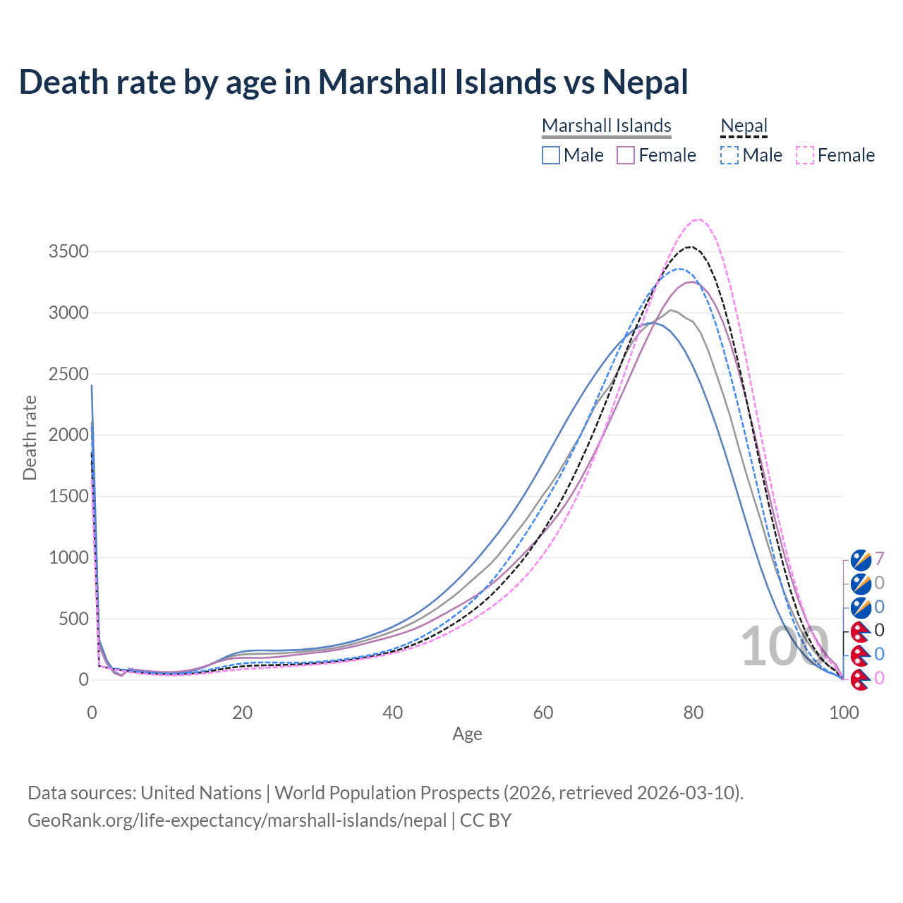 In the Marshall Islands, the most common age of death is 77, compared to 80 in Nepal. The median age of death is 72 in the Marshall Islands and 75.4 in Nepal, meaning only half of each cohort is expected to live past that age.