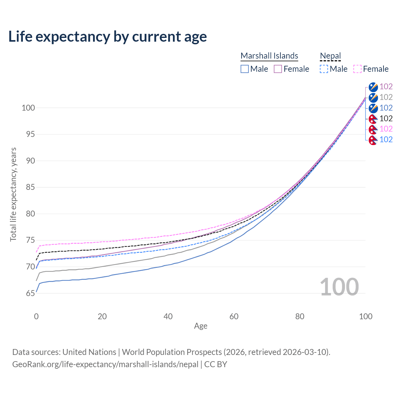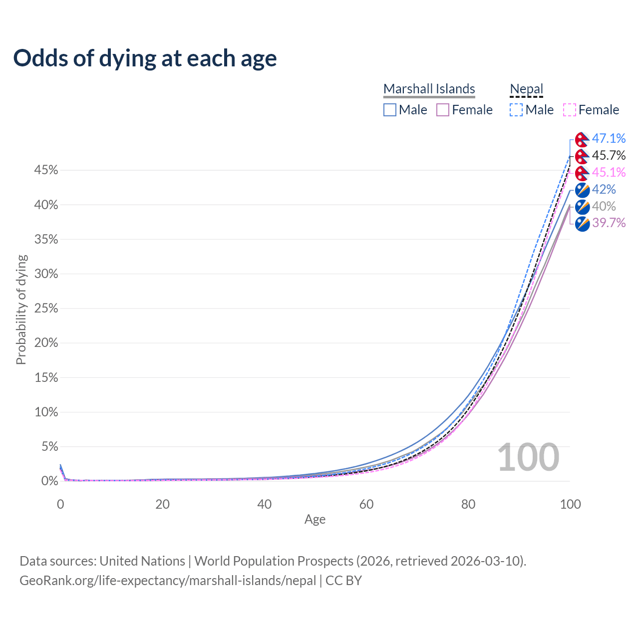 This life expectancy calculator shows the odds of living to 100, 95, 90, and below based on current age for both males and females in the Marshall Islands and Nepal, along with mean and median age of death. The calculations are based on the 2026 life tables (actuarial tables) from the UN World Population Prospects.