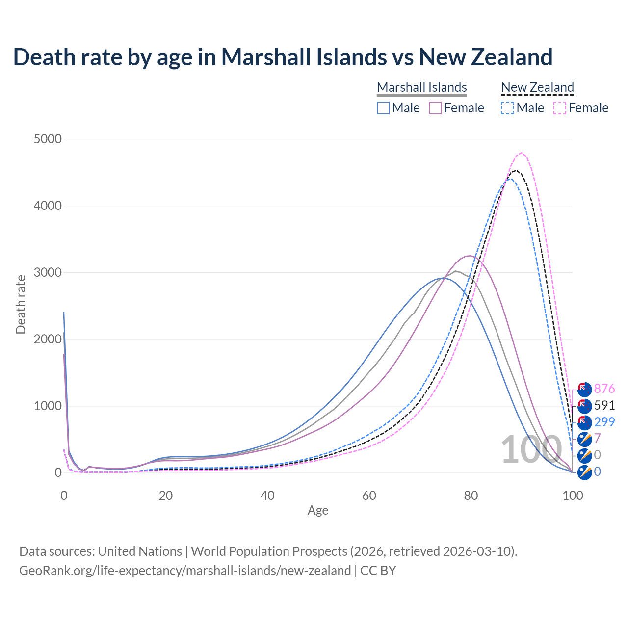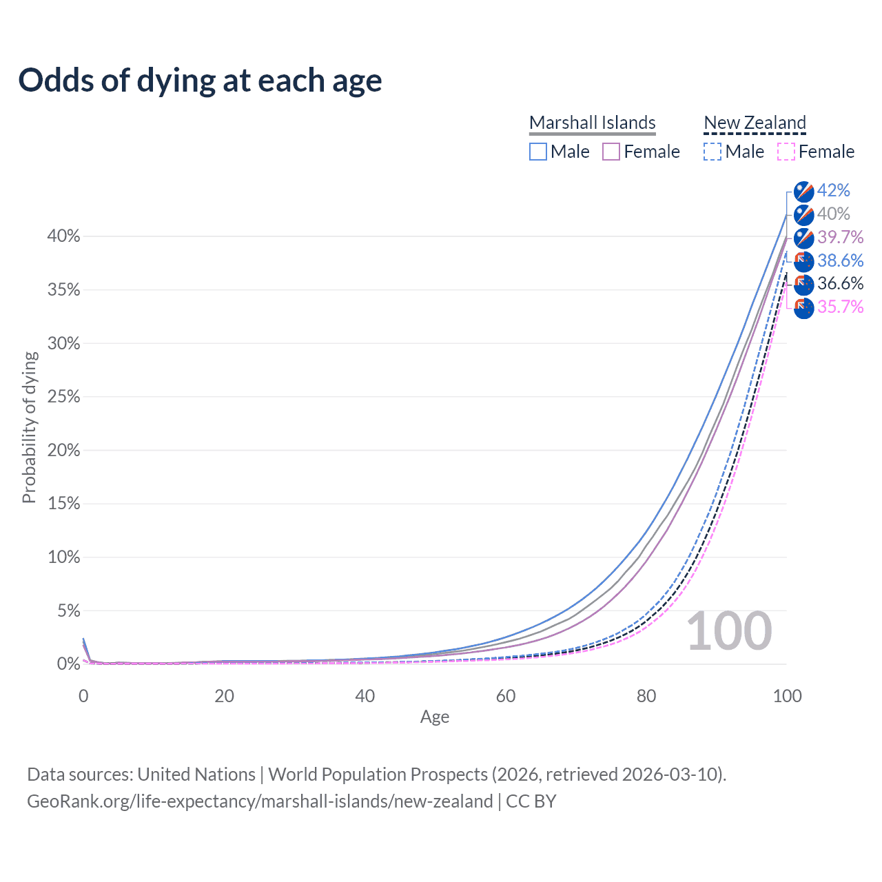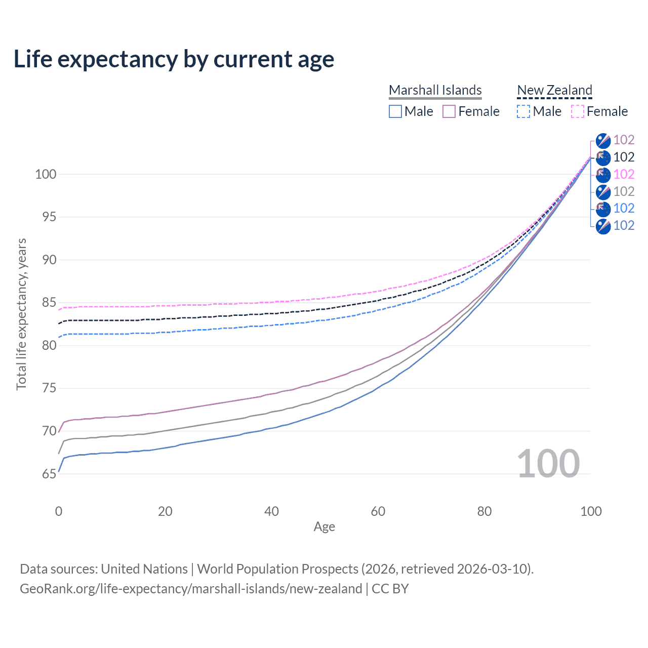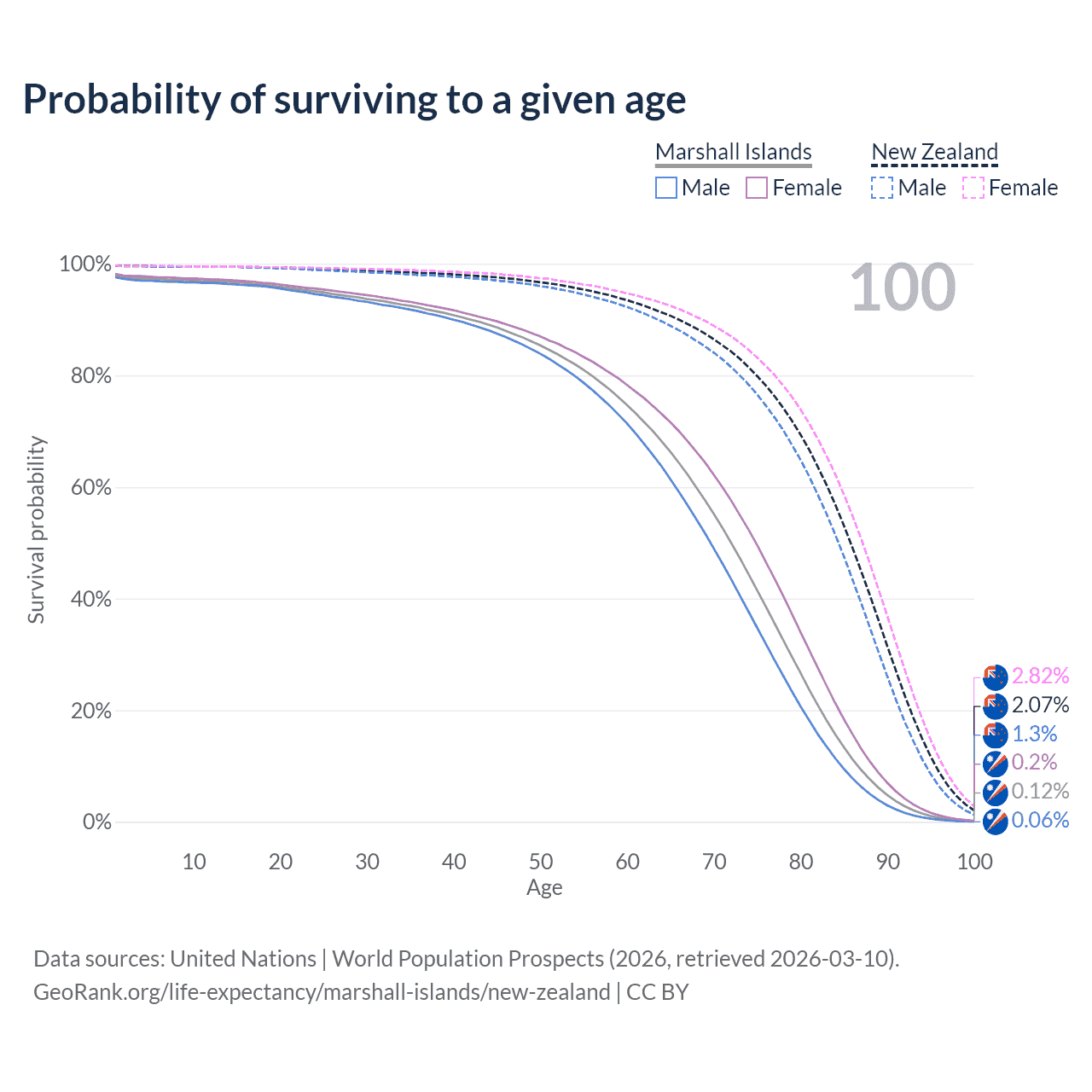This life expectancy calculator shows the odds of living to 100, 95, 90, and below based on current age for both males and females in the Marshall Islands and New Zealand, along with mean and median age of death. The calculations are based on the 2026 life tables (actuarial tables) from the UN World Population Prospects.