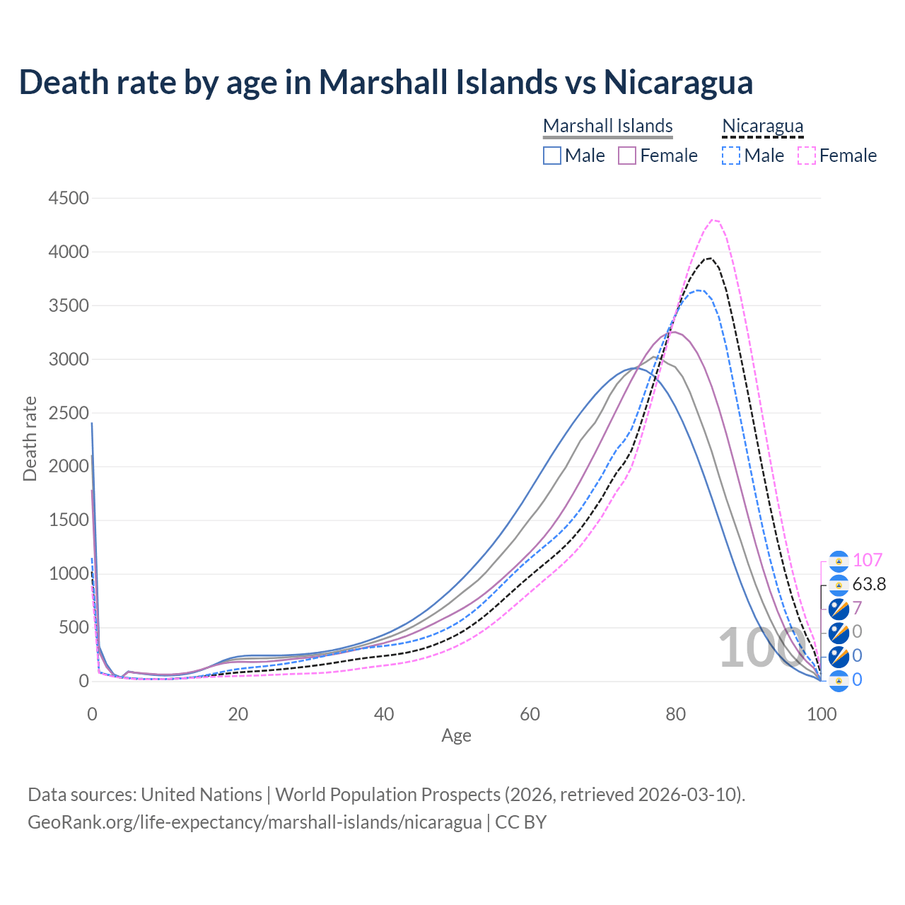In the Marshall Islands, the most common age of death is 77, compared to 85 in Nicaragua. The median age of death is 72 in the Marshall Islands and 79.9 in Nicaragua, meaning only half of each cohort is expected to live past that age.