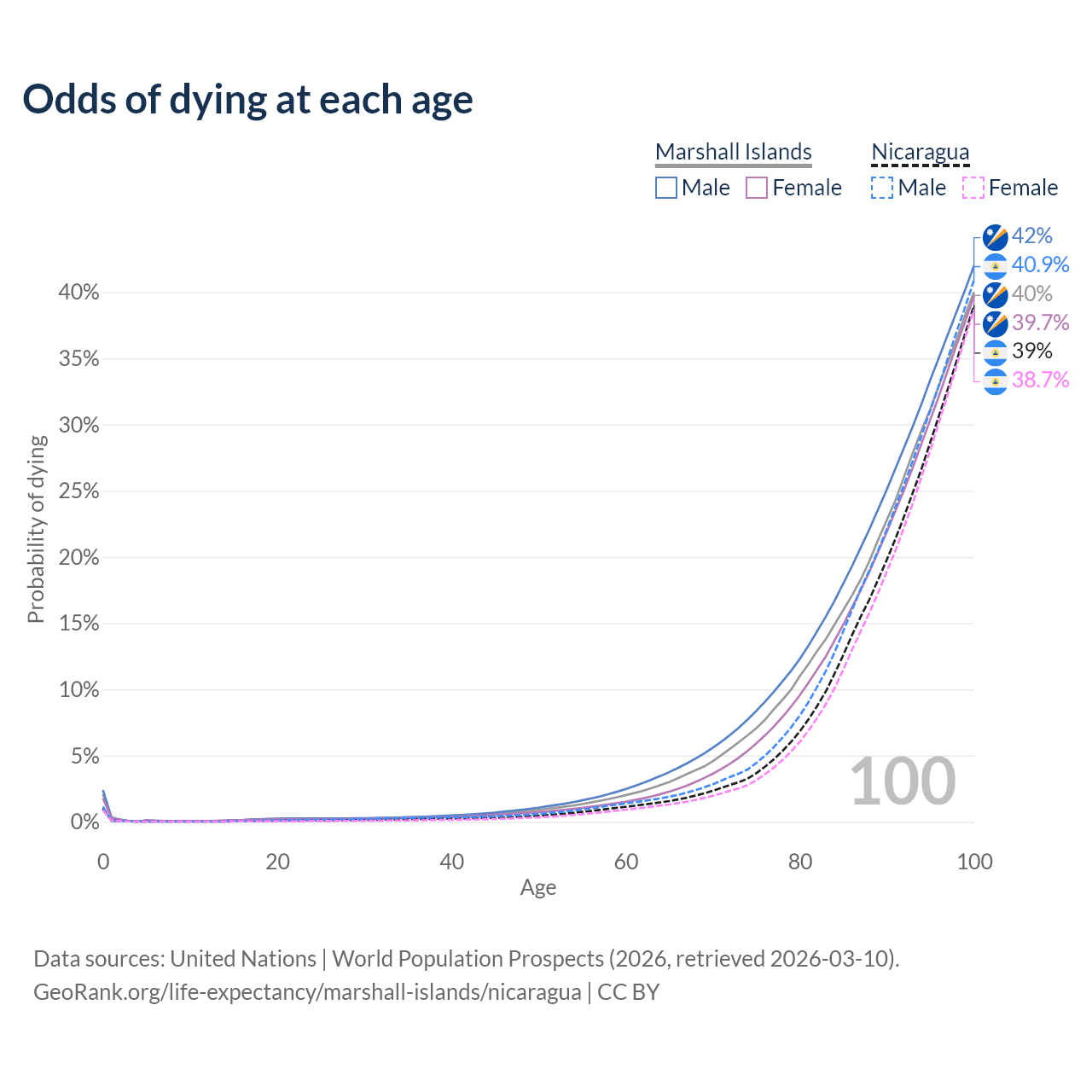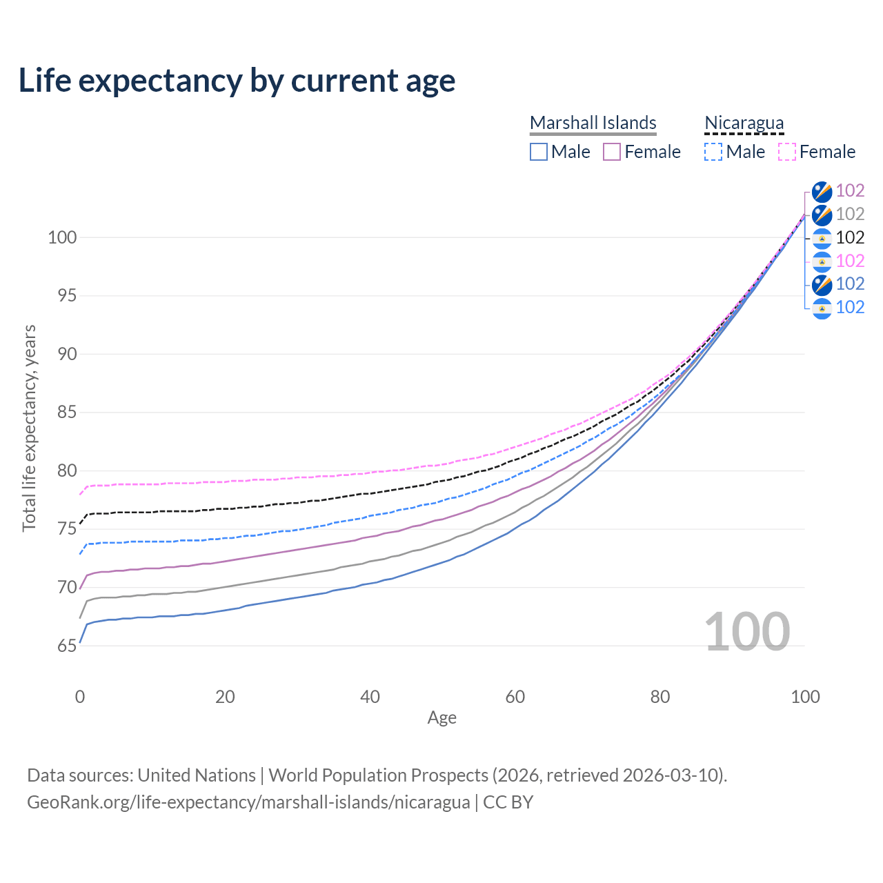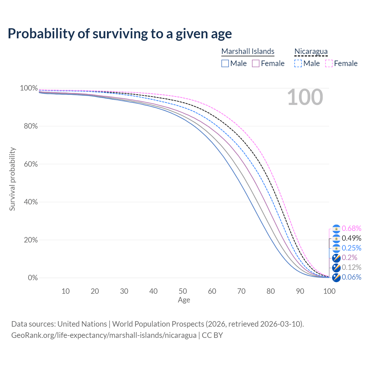 This life expectancy calculator shows the odds of living to 100, 95, 90, and below based on current age for both males and females in the Marshall Islands and Nicaragua, along with mean and median age of death. The calculations are based on the 2026 life tables (actuarial tables) from the UN World Population Prospects.