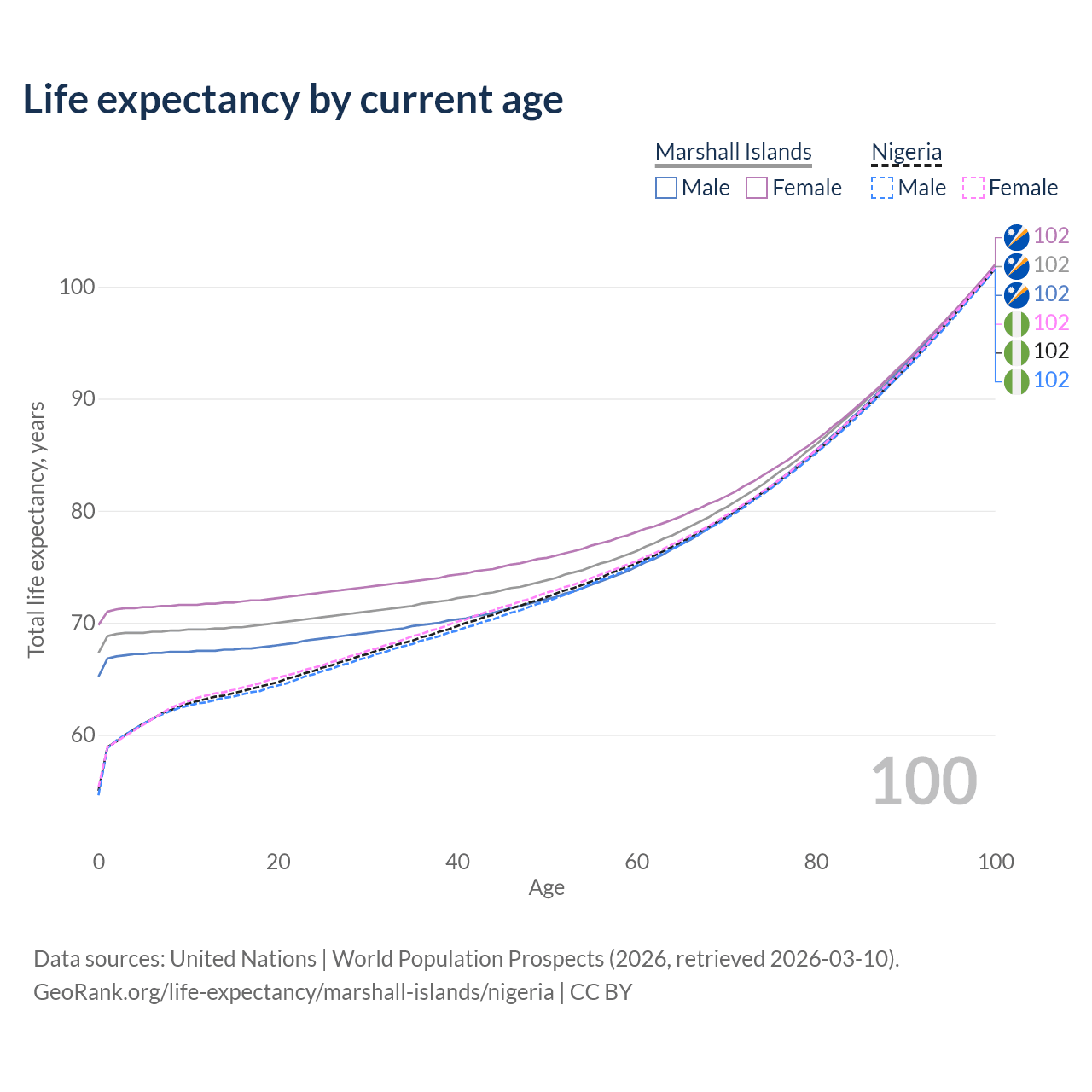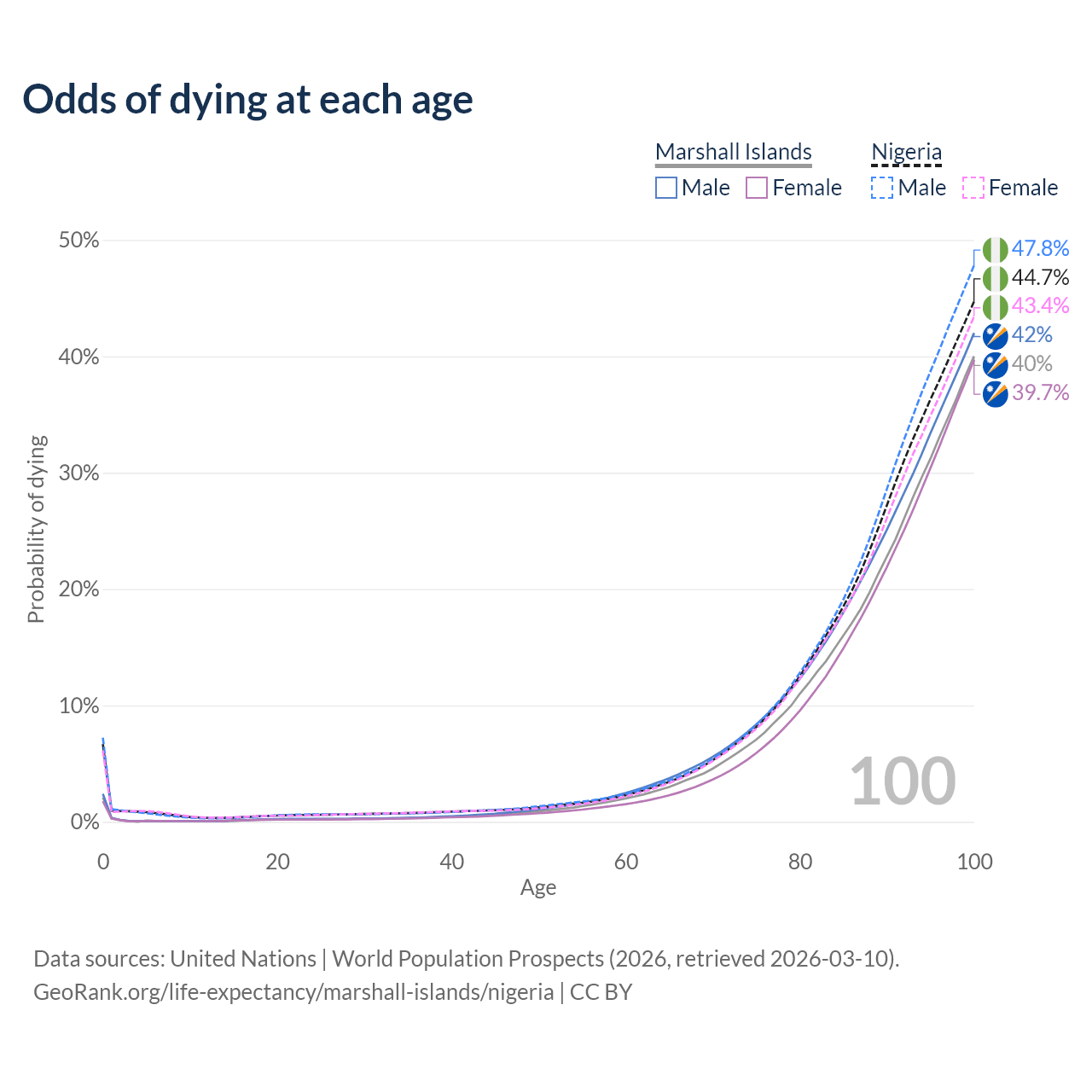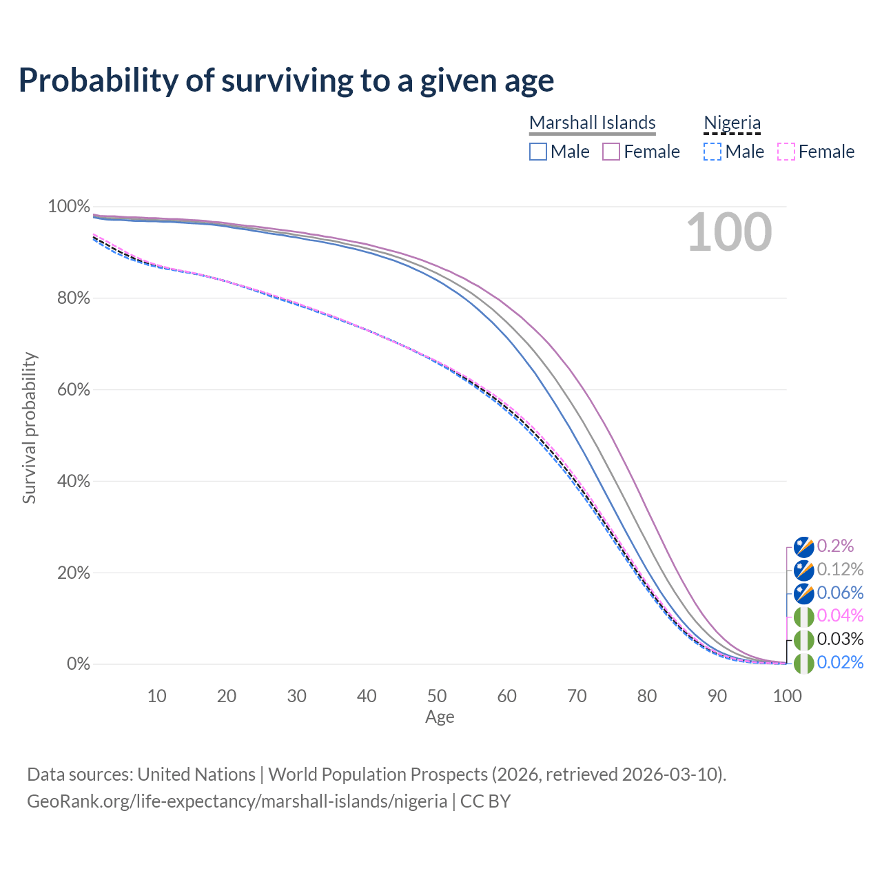 This life expectancy calculator shows the odds of living to 100, 95, 90, and below based on current age for both males and females in the Marshall Islands and Nigeria, along with mean and median age of death. The calculations are based on the 2026 life tables (actuarial tables) from the UN World Population Prospects.