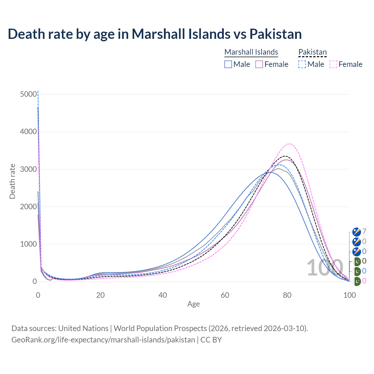 In the Marshall Islands, the most common age of death is 77, compared to 0 in Pakistan. The median age of death is 72 in the Marshall Islands and 74.3 in Pakistan, meaning only half of each cohort is expected to live past that age.