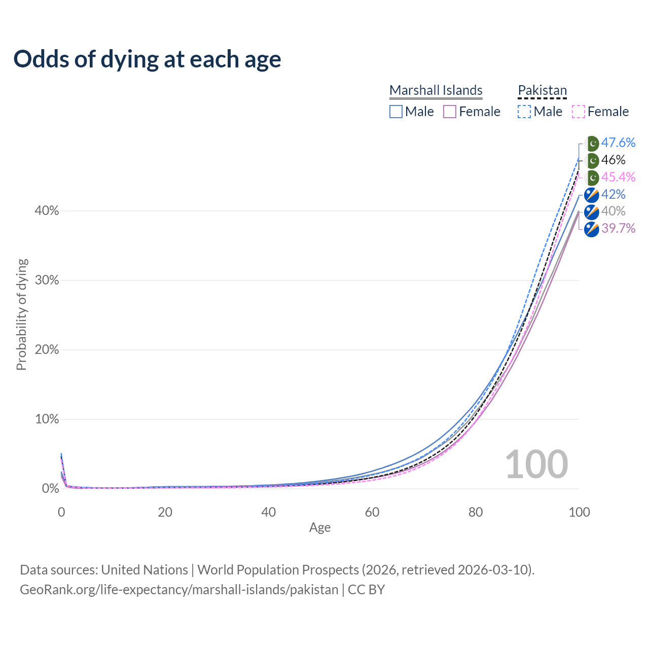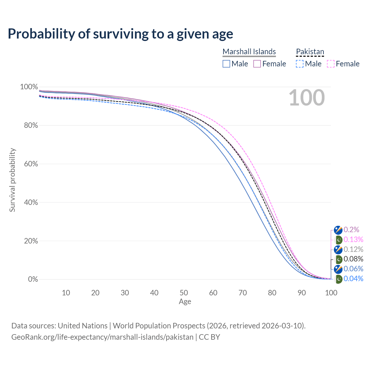 This life expectancy calculator shows the odds of living to 100, 95, 90, and below based on current age for both males and females in the Marshall Islands and Pakistan, along with mean and median age of death. The calculations are based on the 2026 life tables (actuarial tables) from the UN World Population Prospects.