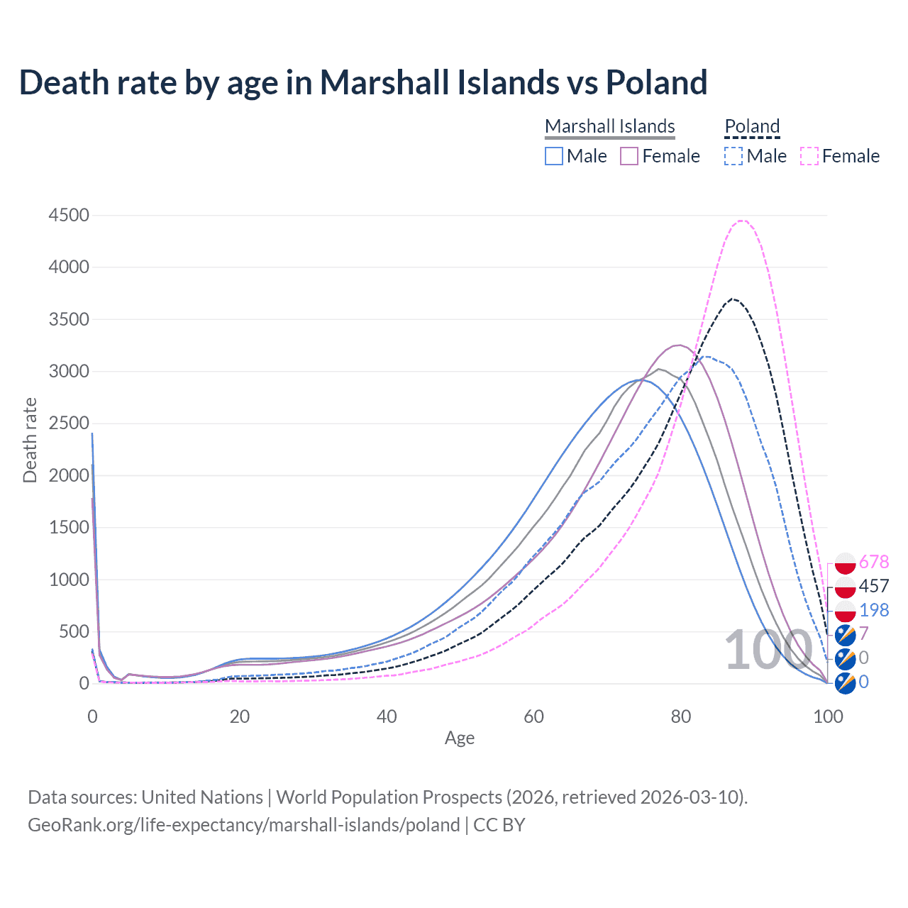 In the Marshall Islands, the most common age of death is 77, compared to 87 in Poland. The median age of death is 72 in the Marshall Islands and 82.5 in Poland, meaning only half of each cohort is expected to live past that age.