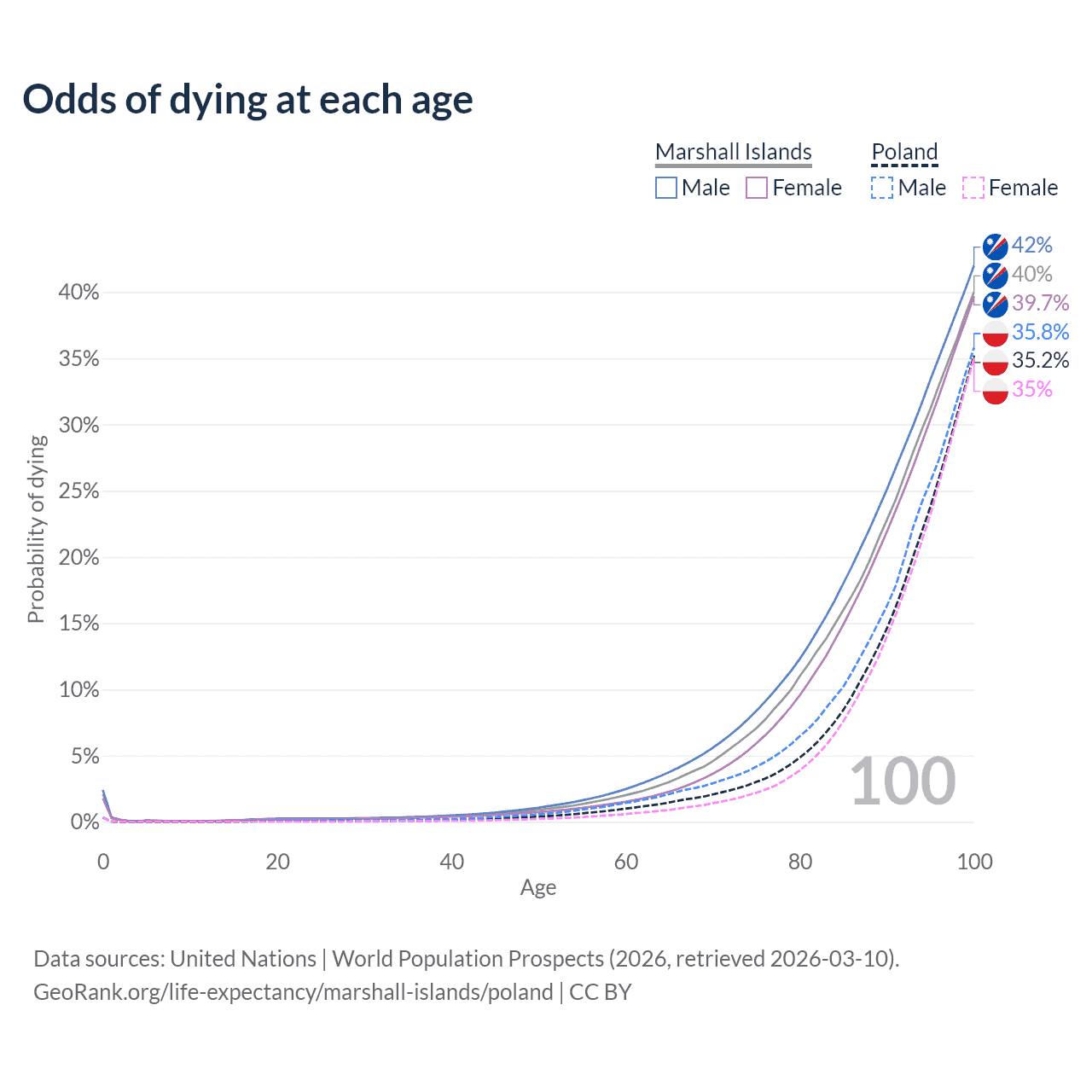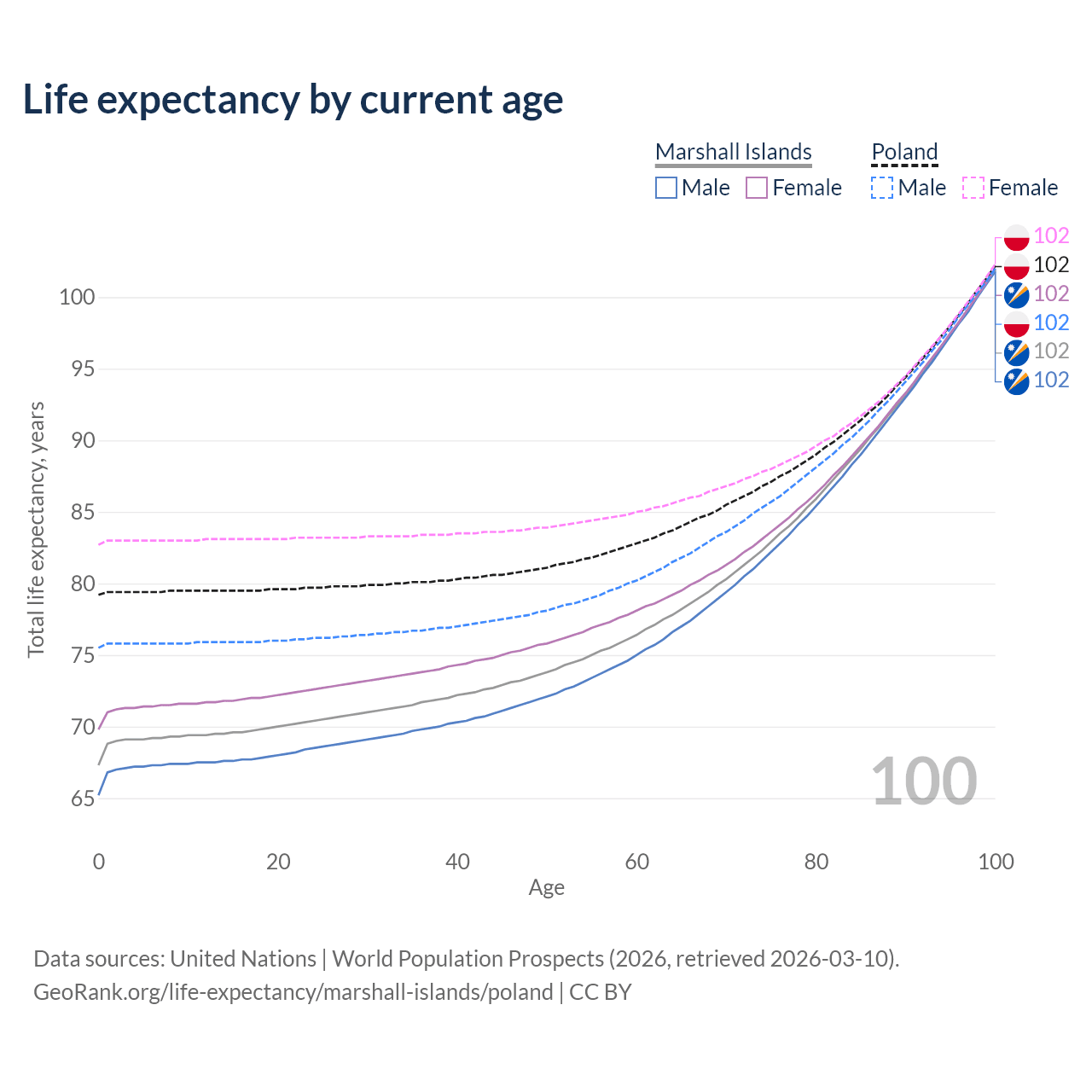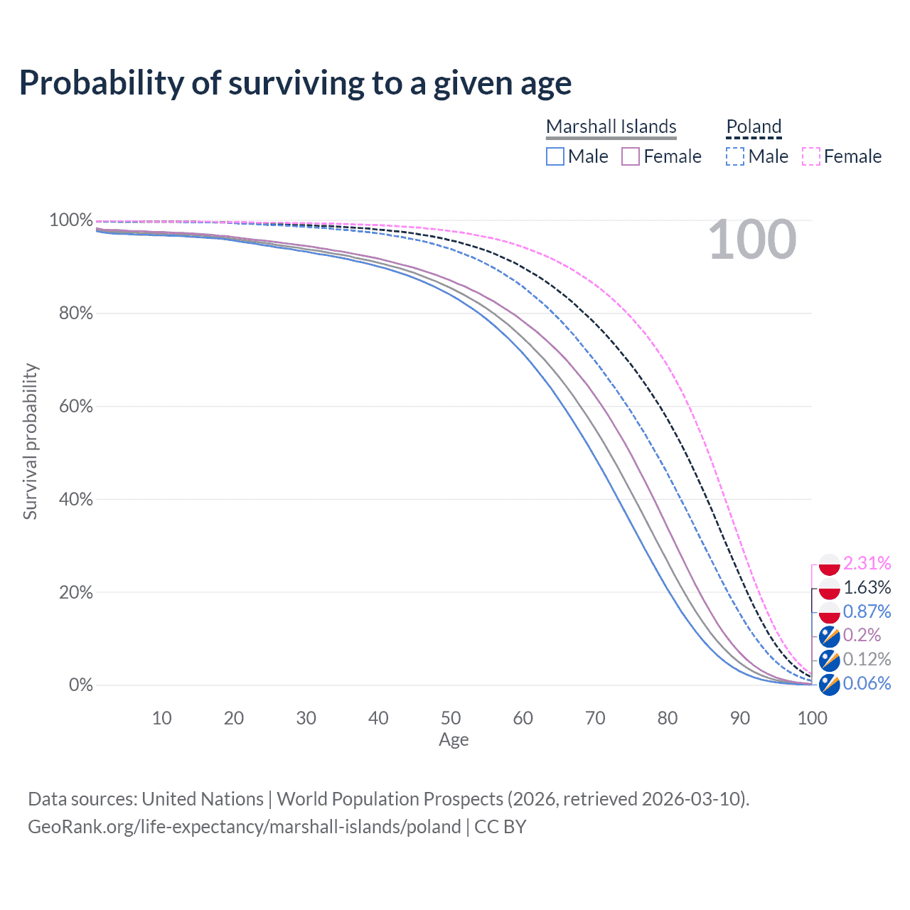 This life expectancy calculator shows the odds of living to 100, 95, 90, and below based on current age for both males and females in the Marshall Islands and Poland, along with mean and median age of death. The calculations are based on the 2026 life tables (actuarial tables) from the UN World Population Prospects.