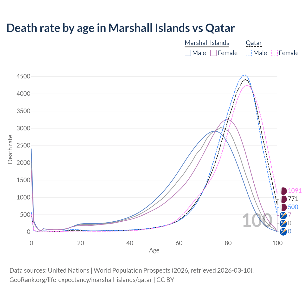 In the Marshall Islands, the most common age of death is 77, compared to 87 in Qatar. The median age of death is 72 in the Marshall Islands and 85.1 in Qatar, meaning only half of each cohort is expected to live past that age.