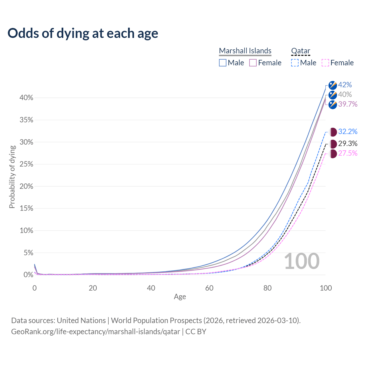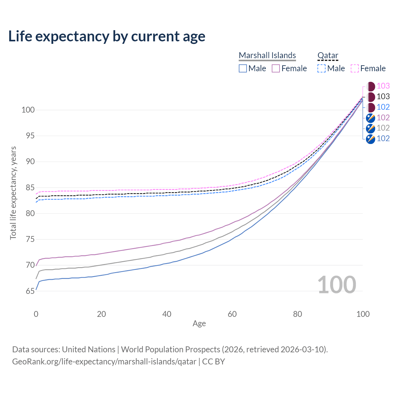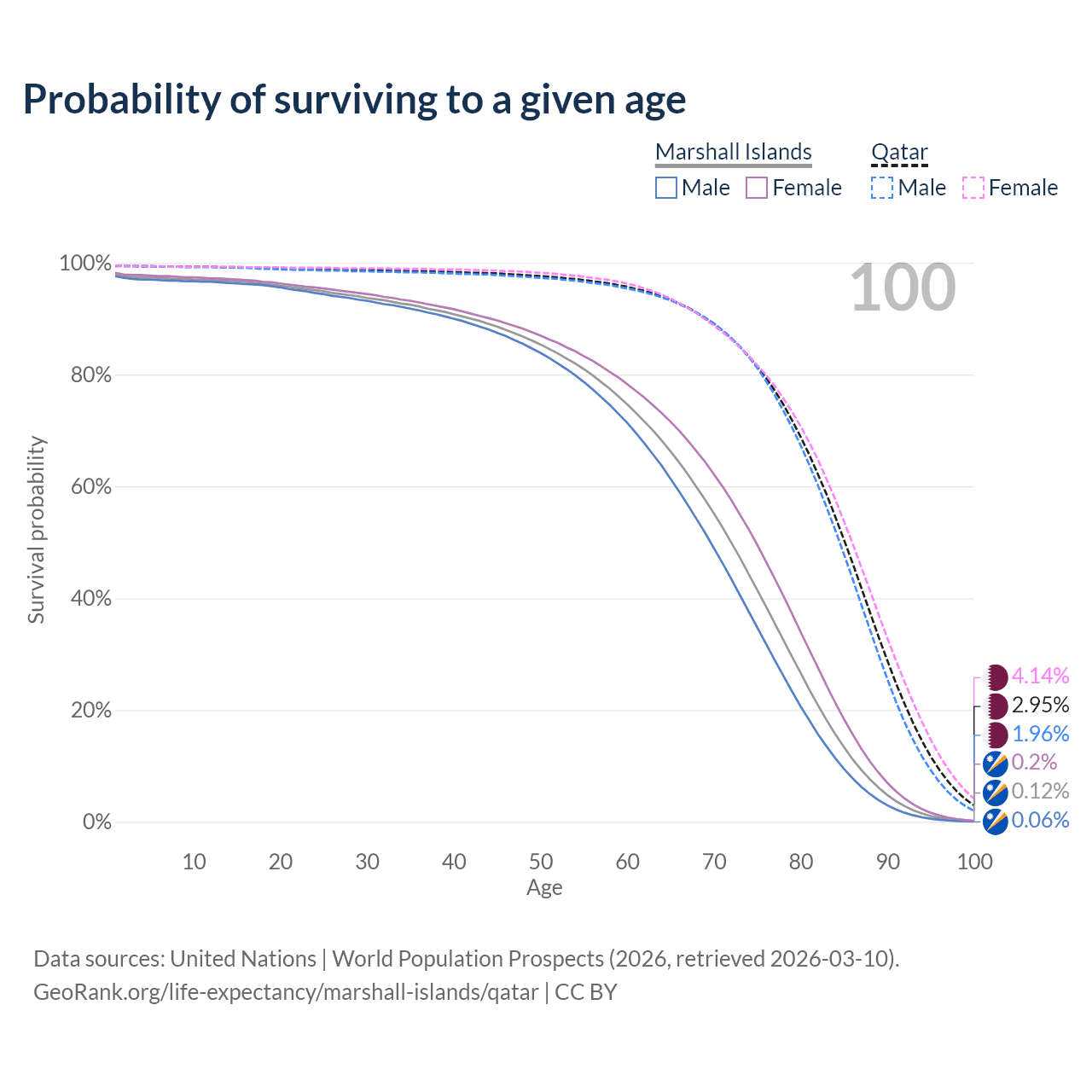 This life expectancy calculator shows the odds of living to 100, 95, 90, and below based on current age for both males and females in the Marshall Islands and Qatar, along with mean and median age of death. The calculations are based on the 2026 life tables (actuarial tables) from the UN World Population Prospects.